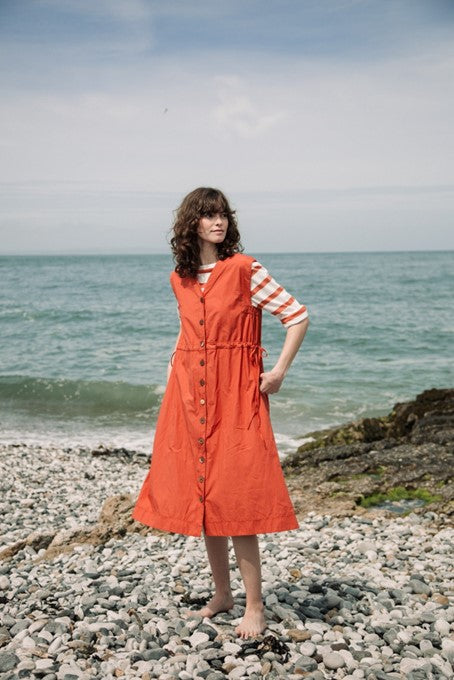 The Athena Dress is a sleeveless tailored style featuring a V-neckline and V detail at the back, a gathered drawstring at the waist, and side pockets.