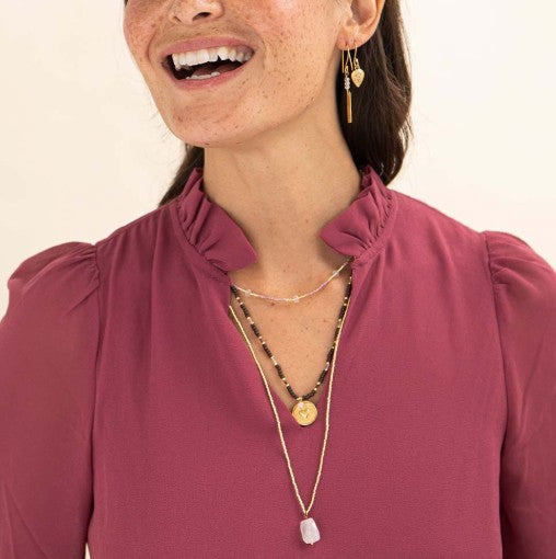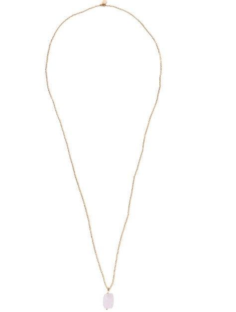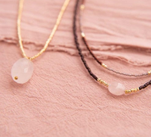 Entdecke die goldfarbige Calm Rosenquarz Halskette von A Beautiful Story. Sie ist aus Glasperlen und vergoldetem Messing gefertigt und mit einem großen ovalen Rosenquarz-Edelstein versehen. Die Halskette ist handgefertigt und hat eine Länge von 65 cm. Du kannst sie alleine tragen oder mit anderen Halsketten von A Beautiful Story kombinieren.