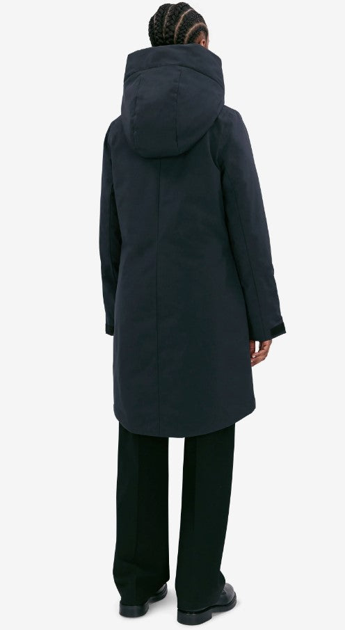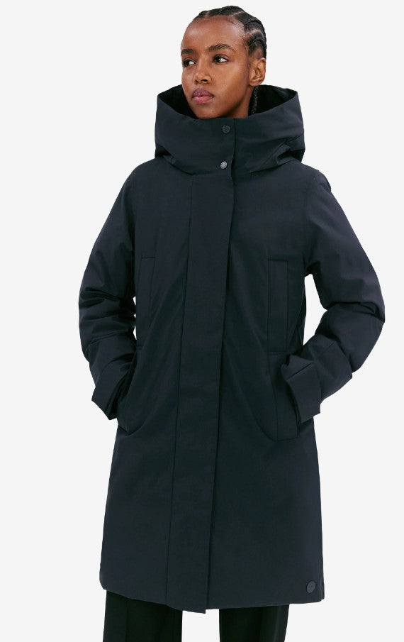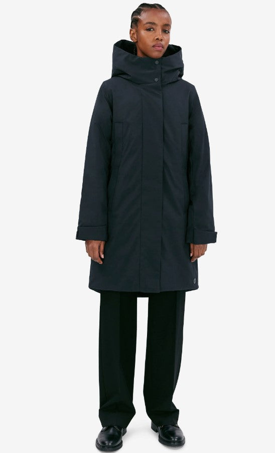 Eline is a hooded winter jacket with a fitted silhouette made in a Pet Poly 5K fabric. The material is quick-drying and has a waterproof membrane that protects from sudden downpour. The 4-way stretch adds comfort while a brilliant colour fastness maintains the jacket’s fresh look from one season to another. Details include double welt pockets and vital taped seams. Eline brings a sophisticated, active look in cold city winters. The model is 174 cm tall and wearing a size S. Length of winter jacket: 96 cm