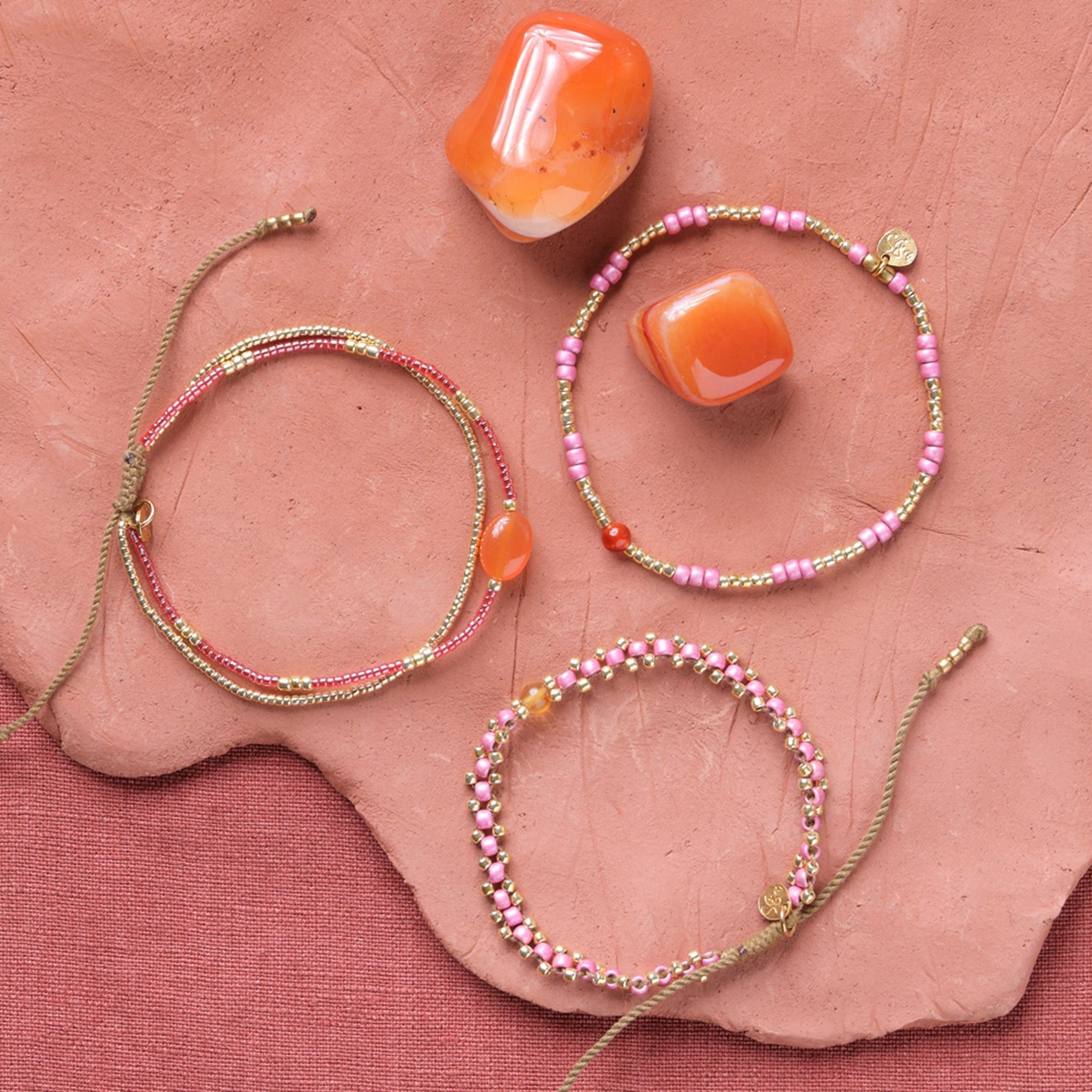 Lerne das Eternal Karneol Goldfarbige Armband von A Beautiful Story kennen. Dieses ausdrucksstarke Schmuckstück besteht aus Glasperlen, Messingperlen und einem Karneol-Edelstein. Das Armband wurde von Hand auf einen Baumwollfaden aufgefädelt und hat einen Schiebeknoten, wodurch es zwischen 16 bis 22 cm verschiebbar ist.