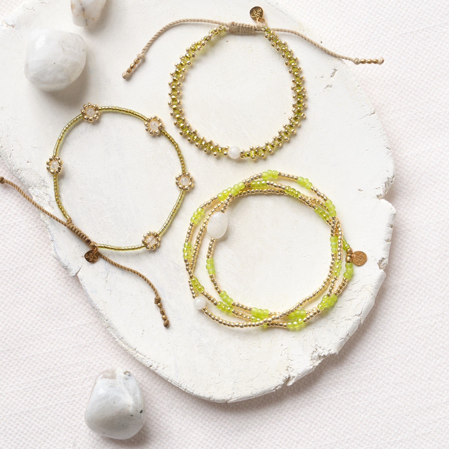 Lerne das Eternal Mondstein Goldfarbige Armband von A Beautiful Story kennen. Dieses ausdrucksstarke Schmuckstück besteht aus Glasperlen, Messingperlen und einem Mondstein. Das Armband wurde von Hand auf einen Baumwollfaden aufgefädelt und hat einen Schiebeknoten, wodurch es zwischen 16 bis 22 cm verschiebbar ist.