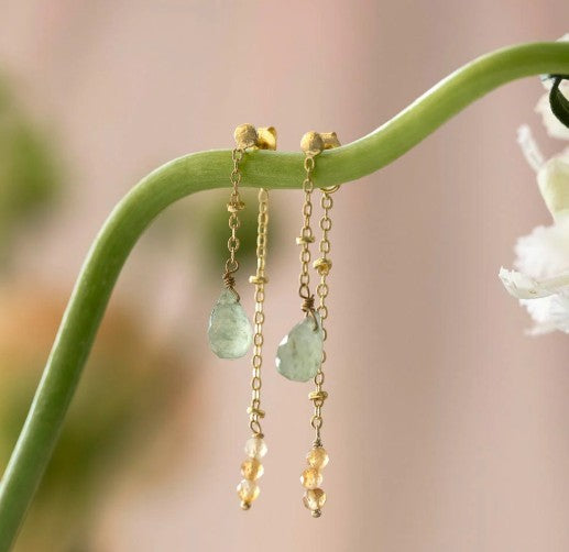 Die vergoldeten Felicity Aventurin Citrin Ohhringe sind handgefertigte, verspielte Ohrringe aus vergoldetem Messing. Sie sind 5 cm lang und haben einen tropfenförmigen, facettierten Aventurin-Anhänger und kleine facettierte Citrin Edelsteine. Der Aventurin motiviert, der Citrin erfüllt jeden Moment mit Glück und Freude.