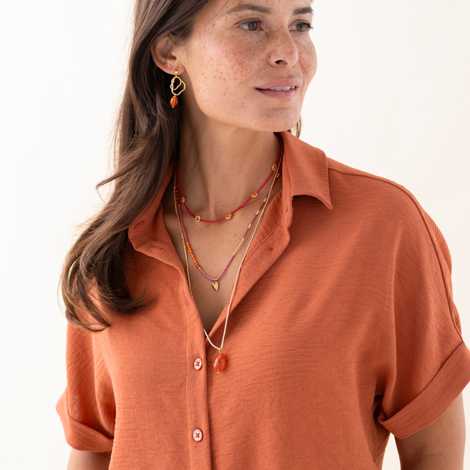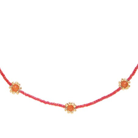 Entdecke die Flourish Karneol Goldfarbige Halskette von A Beautiful Story. Diese bunte Halskette besteht aus Glasperlen und kleinen Karneol-Edelsteinen, die von Hand auf einen Baumwollfaden gefädelt wurden. Die Karneol-Edelsteine und die goldfarbigen Glasperlen bilden zusammen fünf Blumen. Dank des vergoldeten Verschlusses kann die Halskette von 40 bis 43 cm verstellt werden.