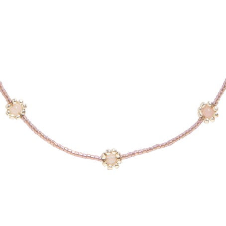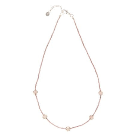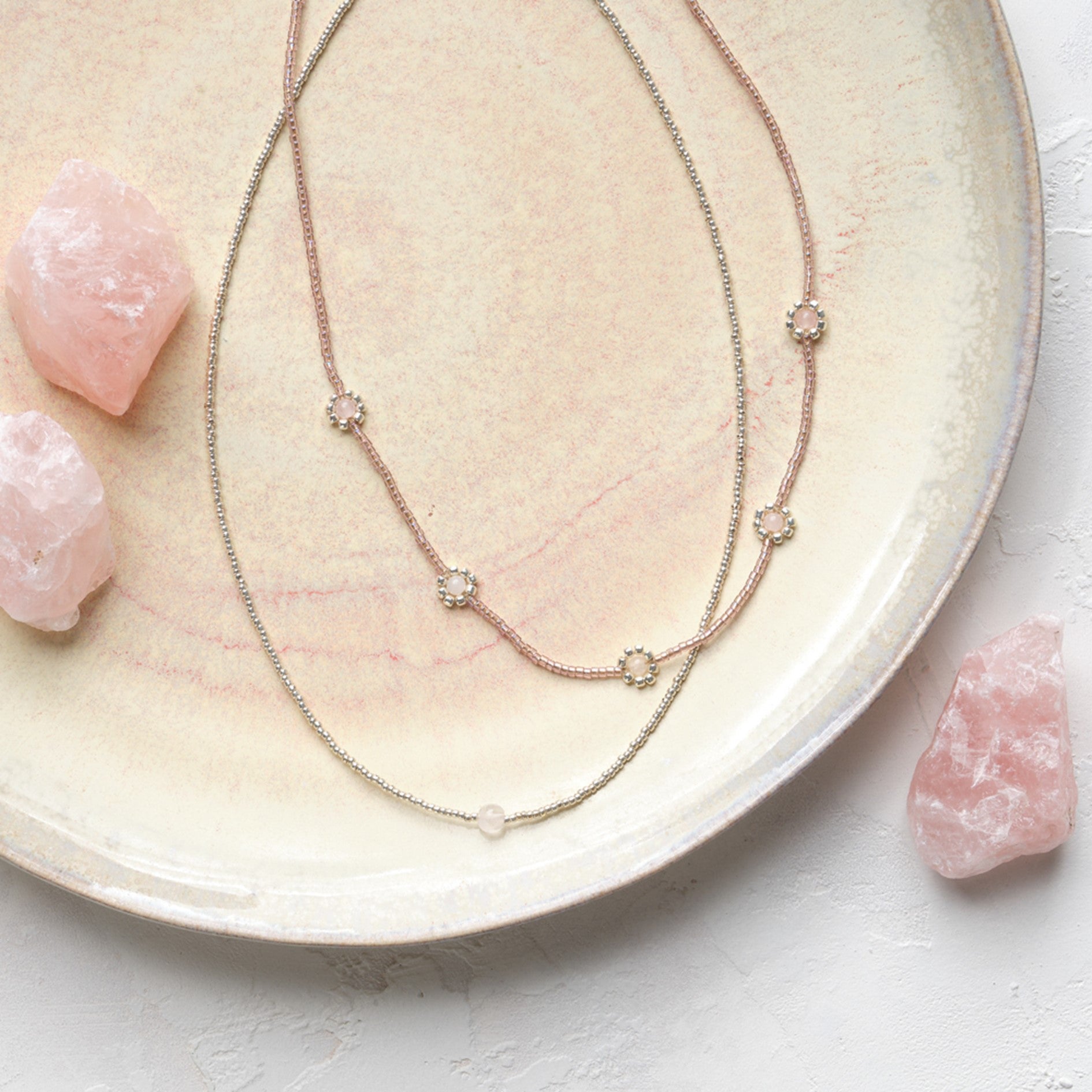 Entdecke die Flourish Rosenquarz Silberfarbige Halskette von A Beautiful Story. Diese bunte Halskette besteht aus Glasperlen und fünf kleinen Rosenquarzen, die von Hand auf einen Baumwollfaden gefädelt wurden. Die Rosenquarz-Edelsteine und die silberfarbigen Glasperlen bilden zusammen fünf Blumen. Dank des versilberten Verschlusses kann die Halskette von 40 bis 43 cm verstellt werden.
