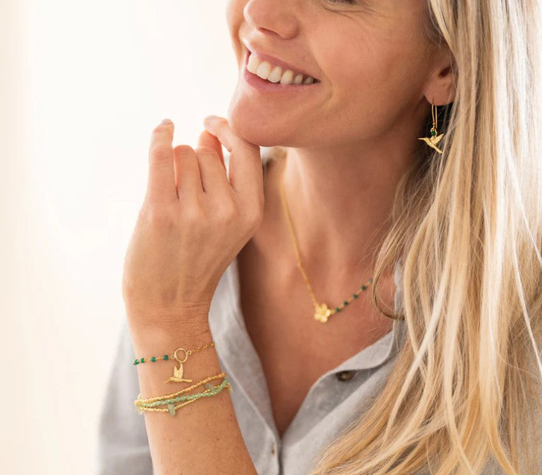Das vergoldete Flowing Aventurin Armband ist ein handgefertigtes Kettenarmband mit kleinen, facettierten Aventurin Edelsteinen und einem vergoldeten Kolibri Anhänger. Das Armband hat einen vergoldeten Verschluss und eine verstellbare Innengröße von 16 - 20 Zentimetern. Der Aventurin motiviert dich, während der Kolibri Hingabe, Intelligenz und Freiheit symbolisiert.