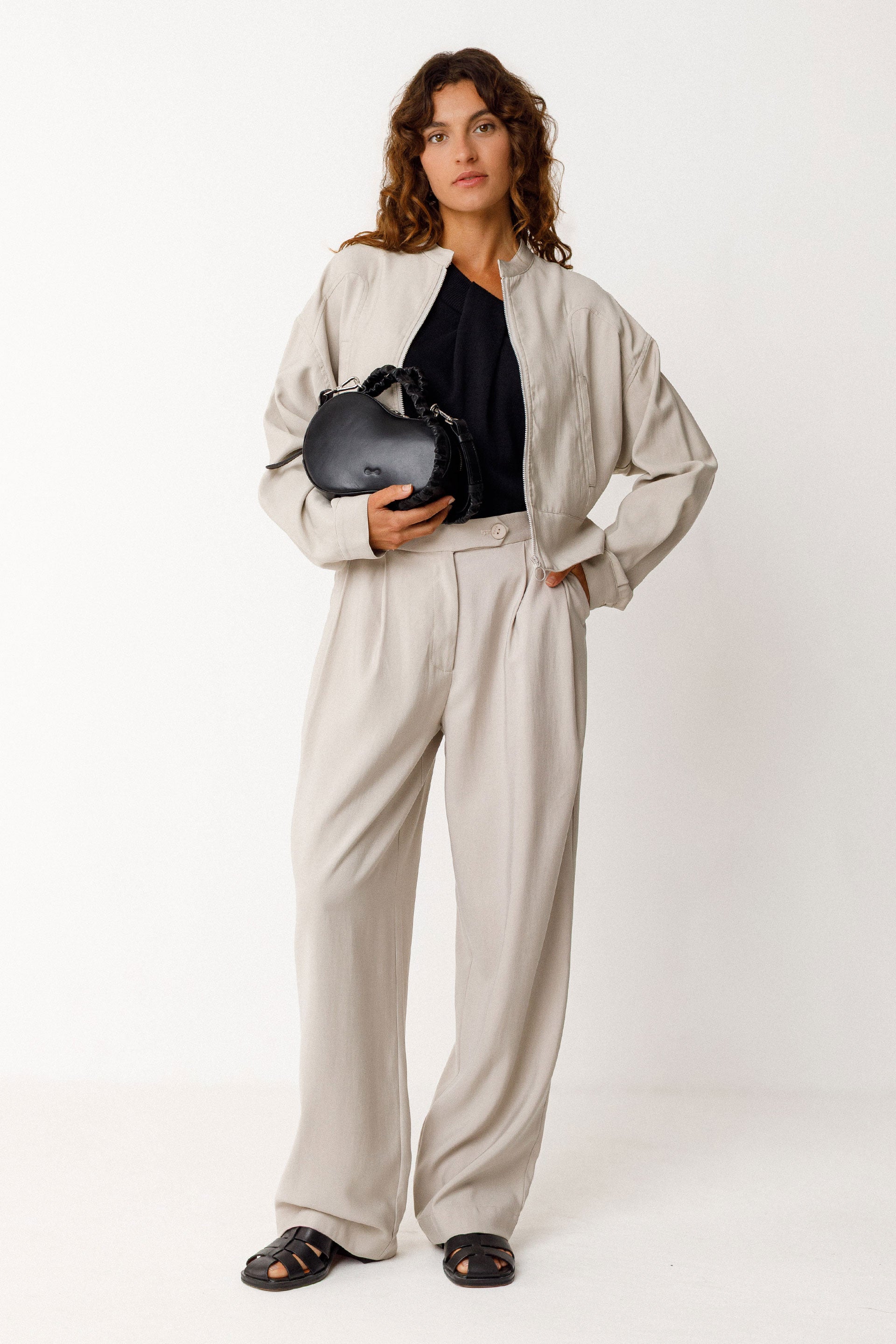 Maßgeschneiderte, gerade geschnittene Hose mit klassischer Taille und geraffter Vorderseite. Innen geschnittener Bund, Leistentaschen und Reißverschluss.