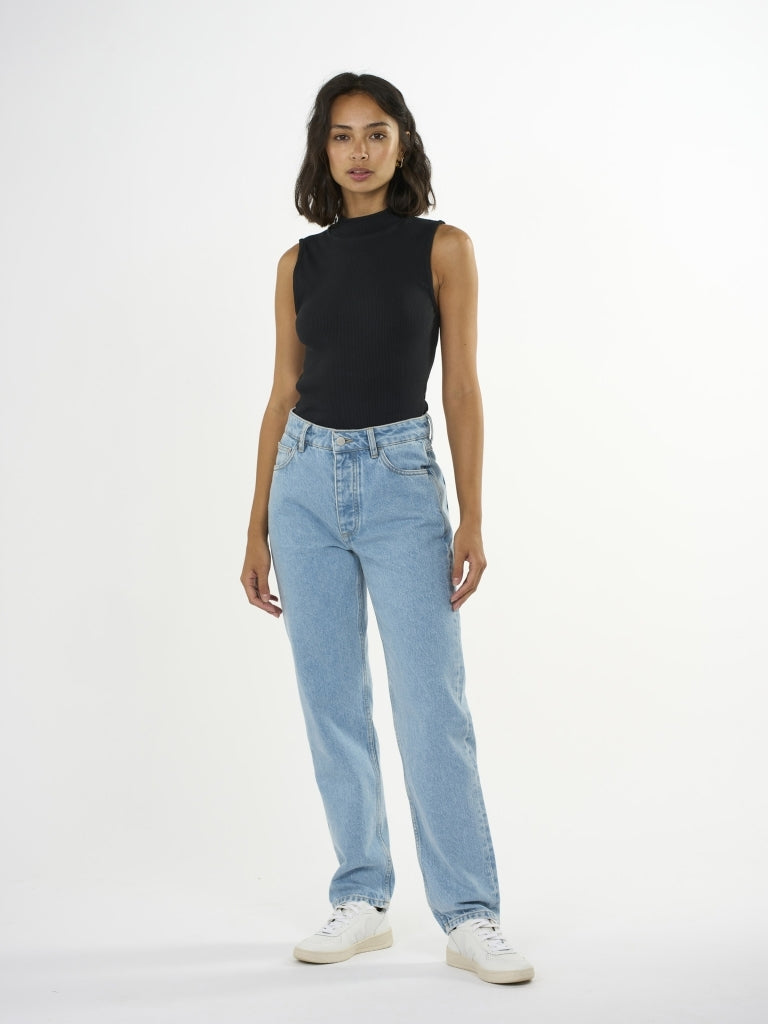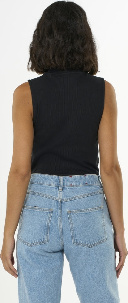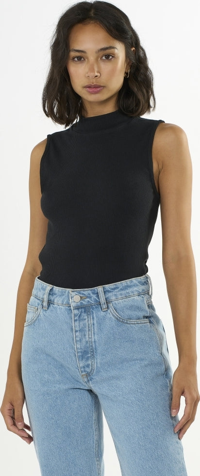 Lassen Sie einfache und zeitlose Styles Ihre Sommergarderobe dominieren. Unser Rippstrick-Top mit hohem Kragen ist die perfekte Wahl für Ihr Sommeroutfit. Es besteht aus einer weichen Mischung aus leichter Bio-Baumwolle und einem kleinen Anteil Elasthan für hohen Tragekomfort. Das Top hat eine schmale Passform, ist ärmellos und verfügt über einen hohen Kragen.