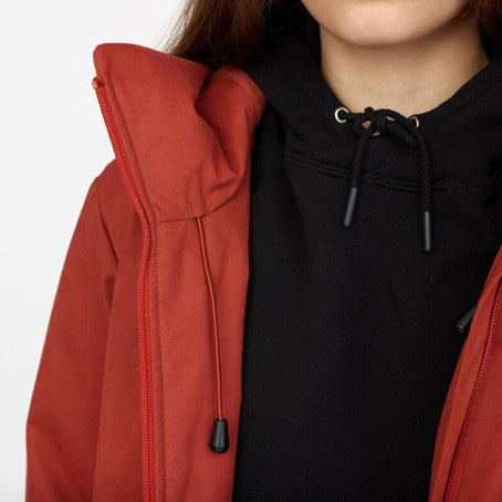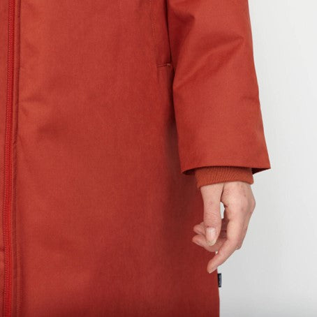 Knee-long hooded jacket made of a recycled polyester mix-fabric with a soft, peached surface and with tone in tone trimmings. The coat is made with a rib cuff at the sleeve-end and an adjustable hood to keep out the wind and cold weather. The characteristic double welt-pockets are made with warm fleece lining. The water-repellent Teflon EcoElite coating is environmentally friendly, free of harmful fluorocarbon. The coat is padded with a thin but very warm Recycled Thinsulate™ insulation, made of 78% recycled fibers. It traps more air in less space and keeps you surprisingly warm