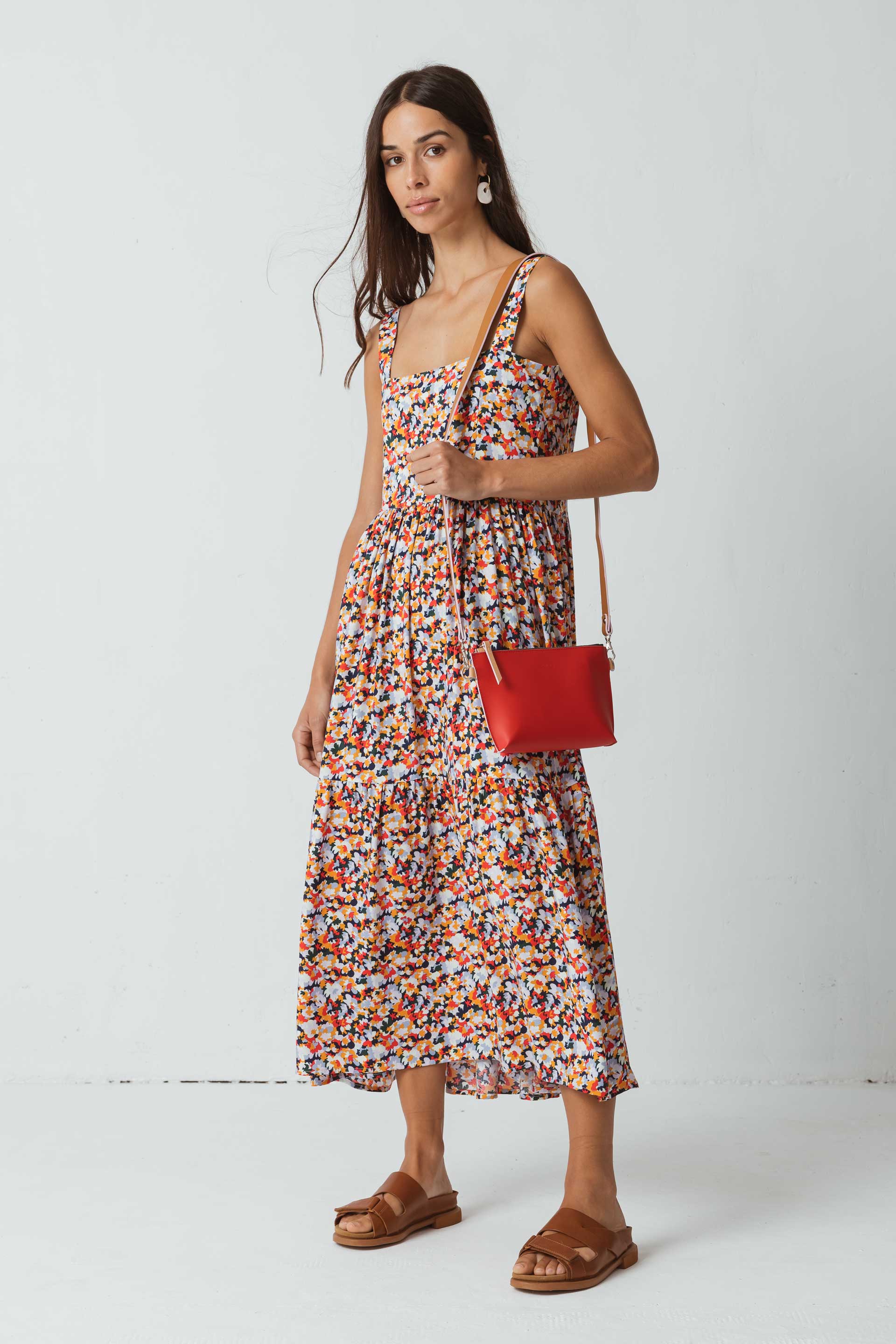 Flared, midi dress. Square neck, fine braces and side pockets. Side zipper fastening. Fluid crepe fabric. Floral print. Light green. LENZING™ ECOVERO™ is the responsible viscose. Not only do we save 50% on emissions and water, but it’s also made of sustainable wood and pulp. In two words: responsible production.