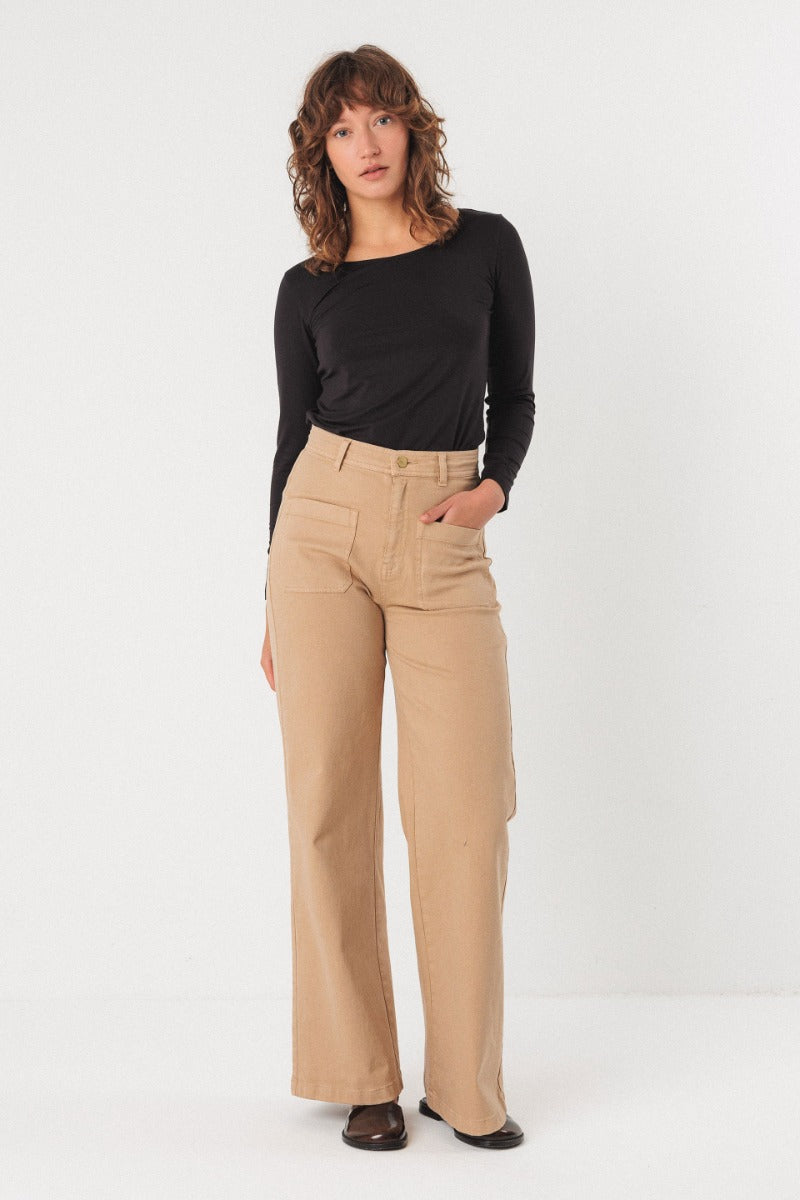 Hose mit weitem Bein, am Knöchel geschnitten. Sie haben einen Hosenschlitz mit Reißverschluss vorne und aufgesetzte Taschen vorne und hinten.
