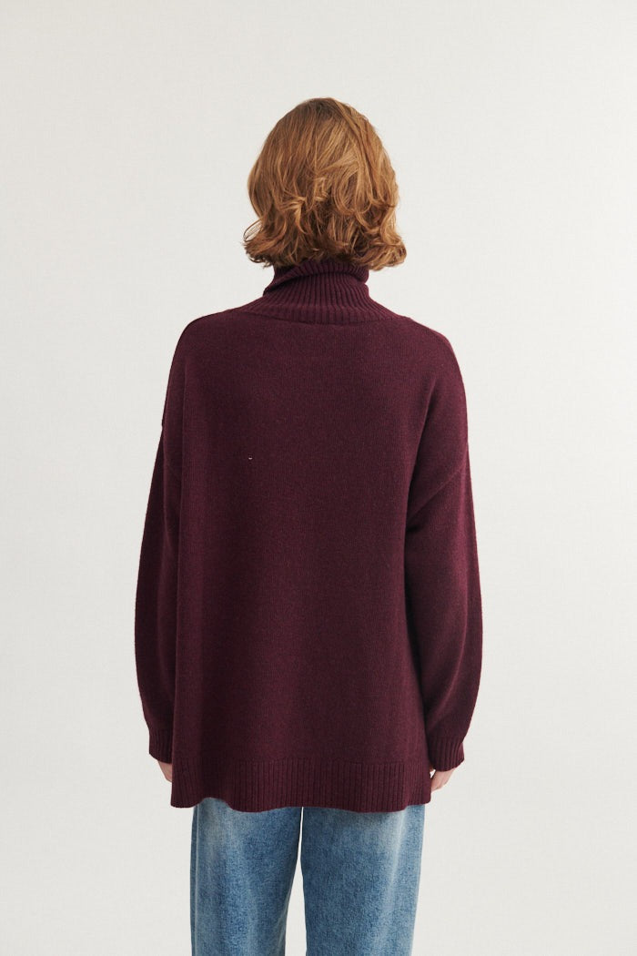 Der Line T-Neck wird in Italien hergestellt und besteht zu 70 % aus recycelter Lammwolle und zu 30 % aus recyceltem Polyamid. Dieser Pullover hat Seitenschlitze, überschnittene Schultern und eine Oversize-Passform.