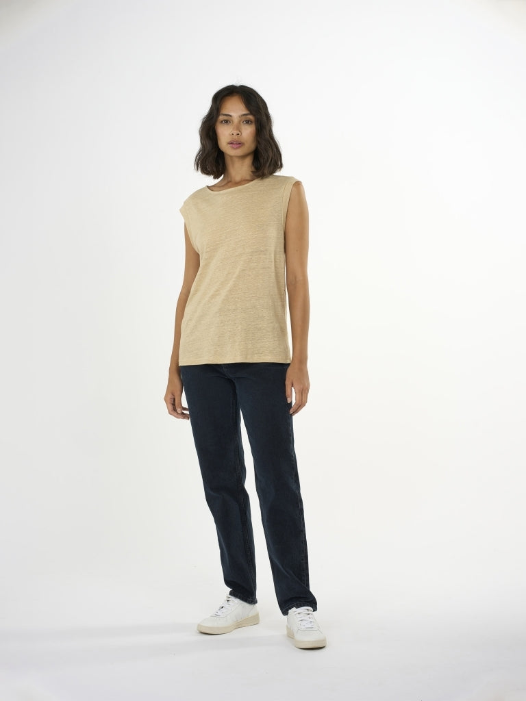 Choose a soft T-shirt for everyday purposes. The linen T-shirt has a loose fit without sleeves and a wide, rounded neckline. Made from 100% organic linen, the quality feels incredibly soft, has a natural melange dye, and is the perfect addition to a comfortable wardrobe.