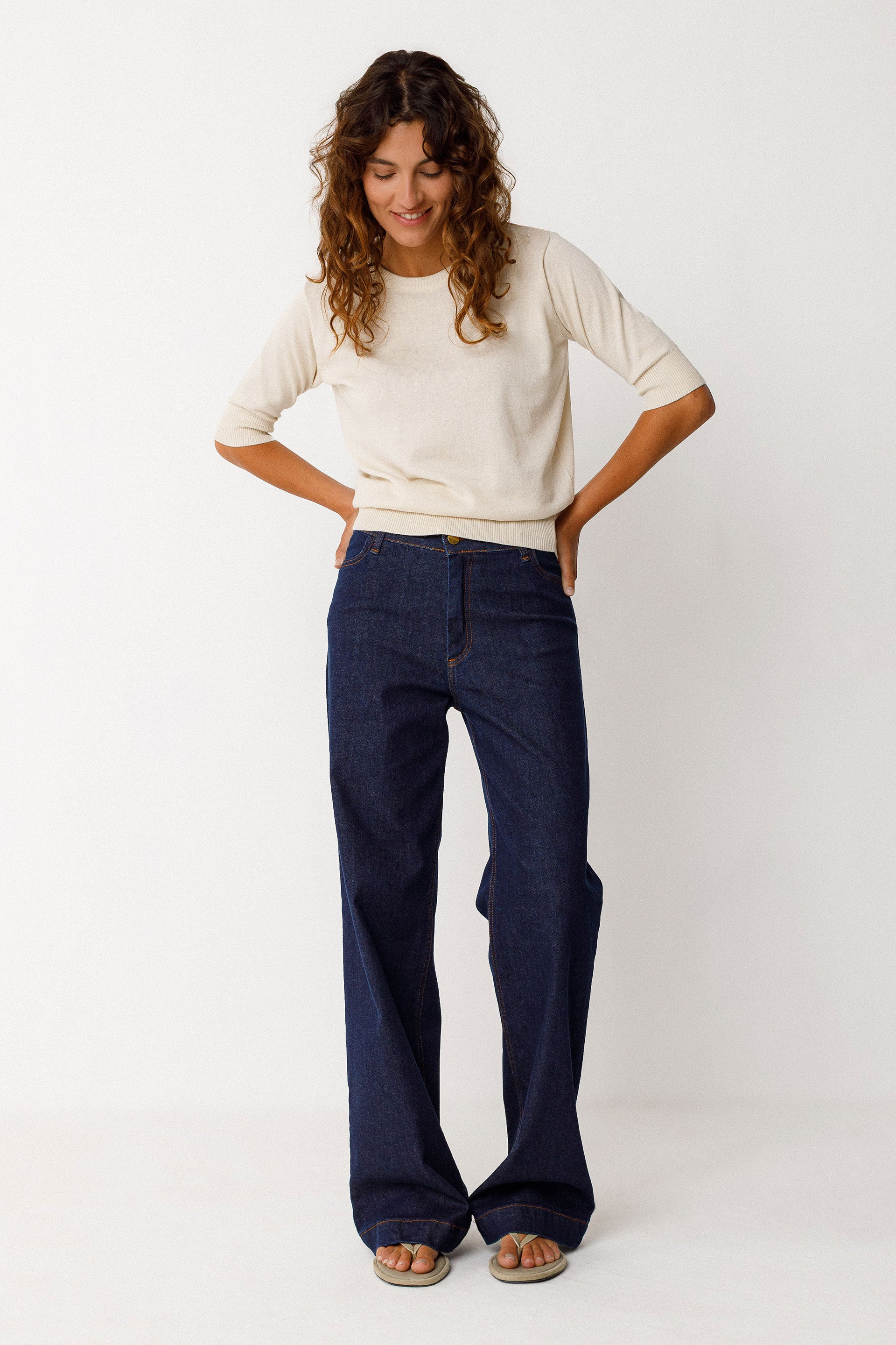 Zweifarbiger, strukturierter Pullover aus leichtem, GOTS-zertifiziertem Bio-Baumwollstrick. Er hat einen Rundhalsausschnitt, 3/4-Ärmel und gerippte Bündchen an Ausschnitt, Ärmeln und Saum.