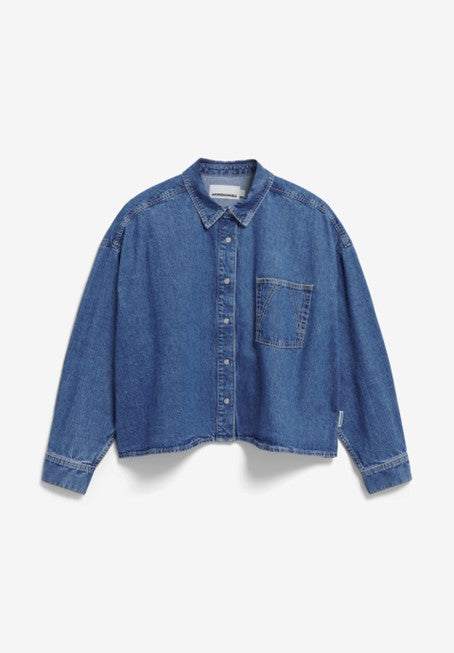 Die NALAANI Jeansbluse ist cropped und locker geschnitten. Sie besteht aus Bio- und recycelter Baumwolle und kommt mit Hemdkragen, überschnittenen Schultern, Brusttasche und Knopfleiste.
