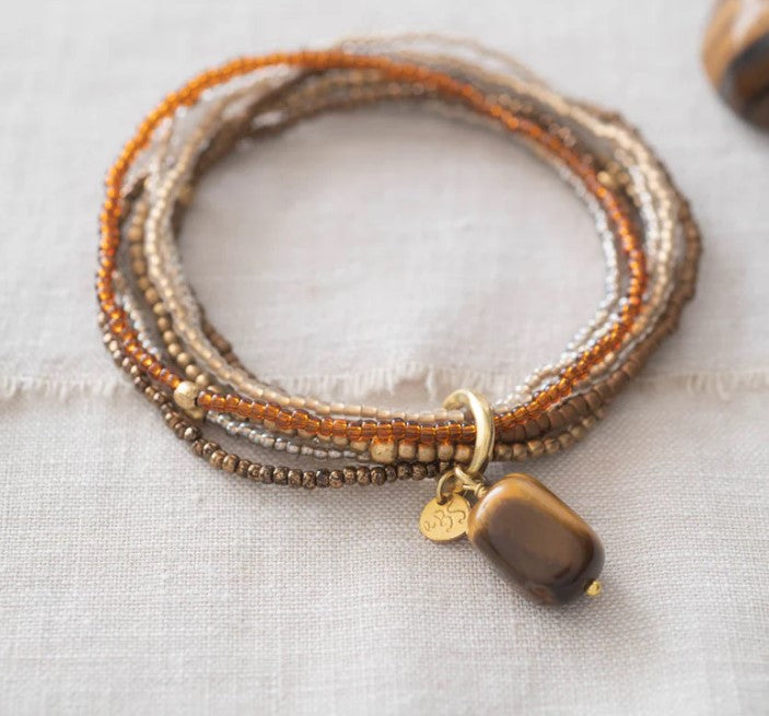 Das goldfarbige Nirmala Tigerauge Armband von A Beautiful Story hat sieben elastische Stränge. Die Stränge bestehen aus farbenfrohen Glasperlen und vergoldeten Messingperlen, die auf ein Gummiband aufgezogen sind. Sie sind durch einen handgefertigten, goldfarbigen Ring verbunden, an dem ein großer Tigerauge-Edelstein befestigt ist. Die Länge des Armbands beträgt 17 cm.