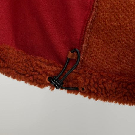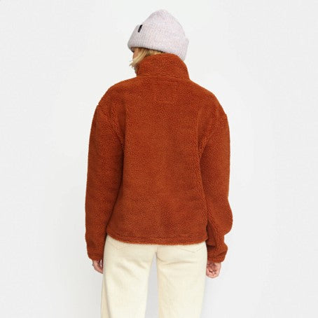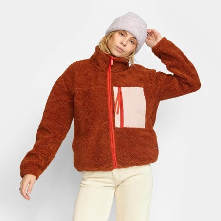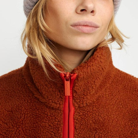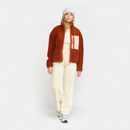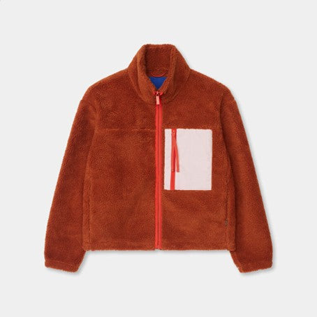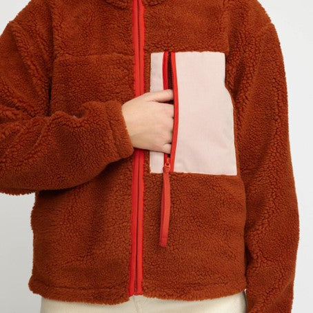 Cozy teddy jacket with a high collar, made in a recycled polyester teddy fabric. The jacket is designed with a characteristic zipped chest-pocket in a soft, brushed contrast-color fabric. The sleeve-ends are gathered with an elastic cord, and the adjustable bottom hemline gives different styling possibilities to the jacket