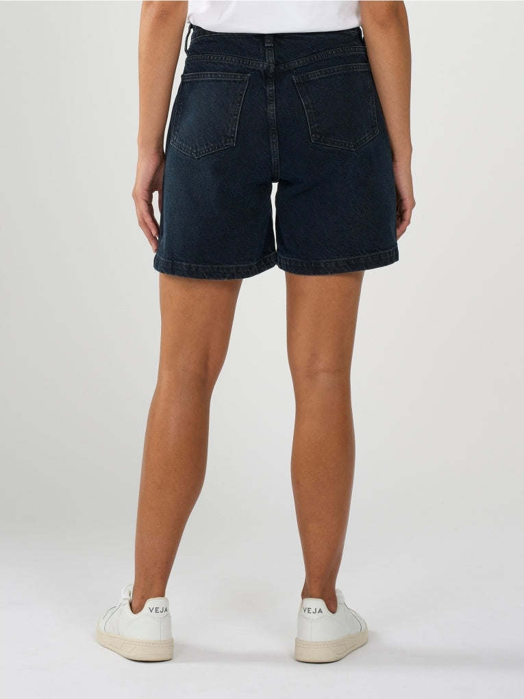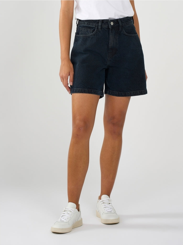 Our REBORN™ denim shorts are a conscious yet fashionable choice as every piece of clothing in the REBORN™ range is made of recycled and reused materials. Besides their regular fit, the shorts are made of heavy over-dyed black denim from 100% recycled organic cotton that will last through seasons. The shorts are mid-waisted and finished with five pockets, belt straps, and button closure.