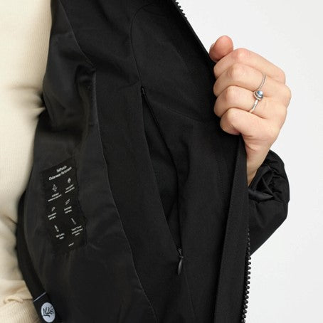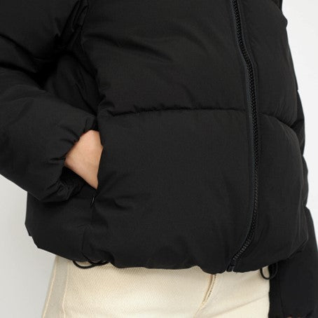 Puffer jacket in a subtle cropped design, made of a thin stretchable recycled polyester mix-fabric. The puffer jacket is made with a bold tone in tone Vislon zipper, a standup collar, and an adjustable bottom hemline. The side-pockets with hidden zippers are lined with warm fleece lining for extra comfort. The water-repellent Teflon EcoElite coating is environmentally friendly, free of harmful fluorocarbon. The warm and highly compressible insulation is a DuPont Sorona Padding, a fiber partially made with renewable plant-based ingredients and produced with particular attention toward the environment
