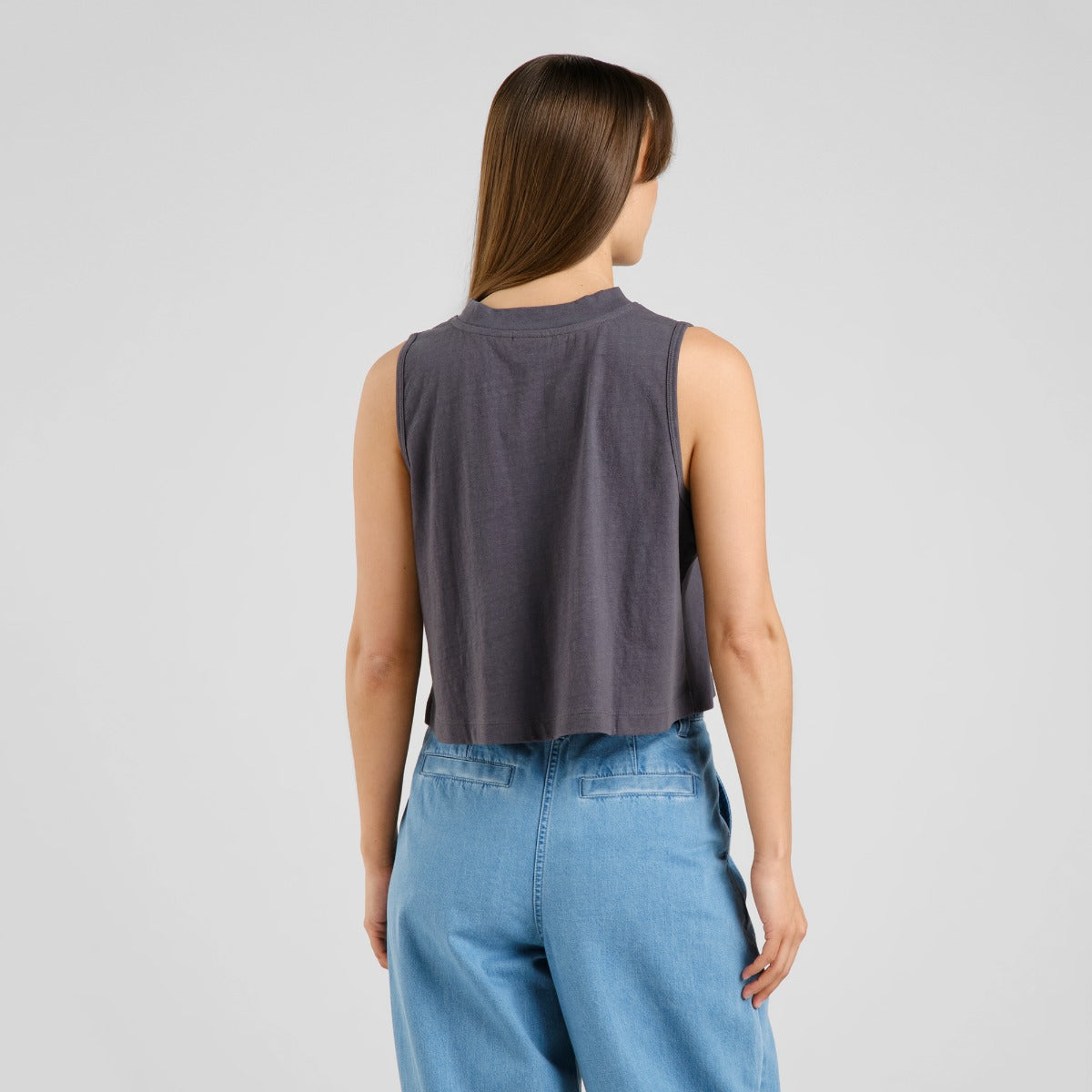 Damen-Crop-Top in kastiger Passform mit weiten Öffnungen an den Ärmeln. Hergestellt in einer Bio-Baumwolle/Hanf-Qualität