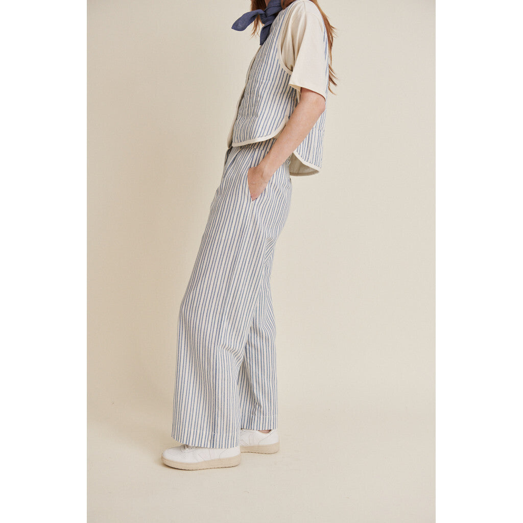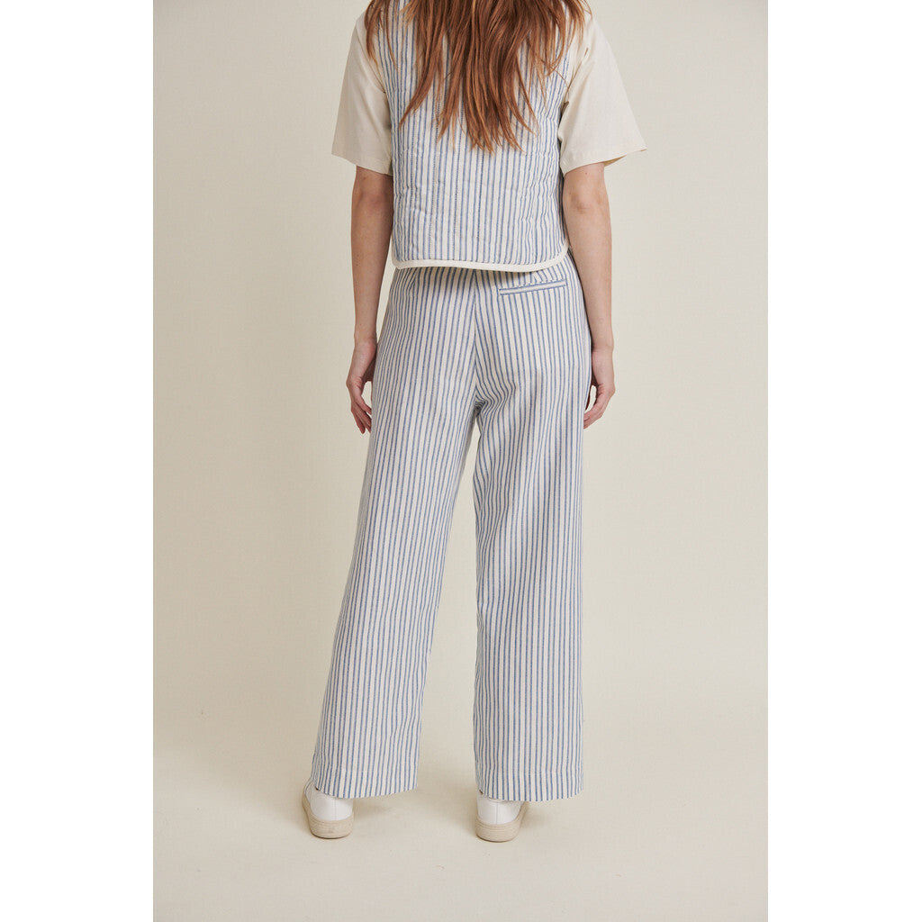 Our new Trudie Pants have been made from a 100% organic cotton quality with stripes. The pants have pleats at front and a zipper closure.