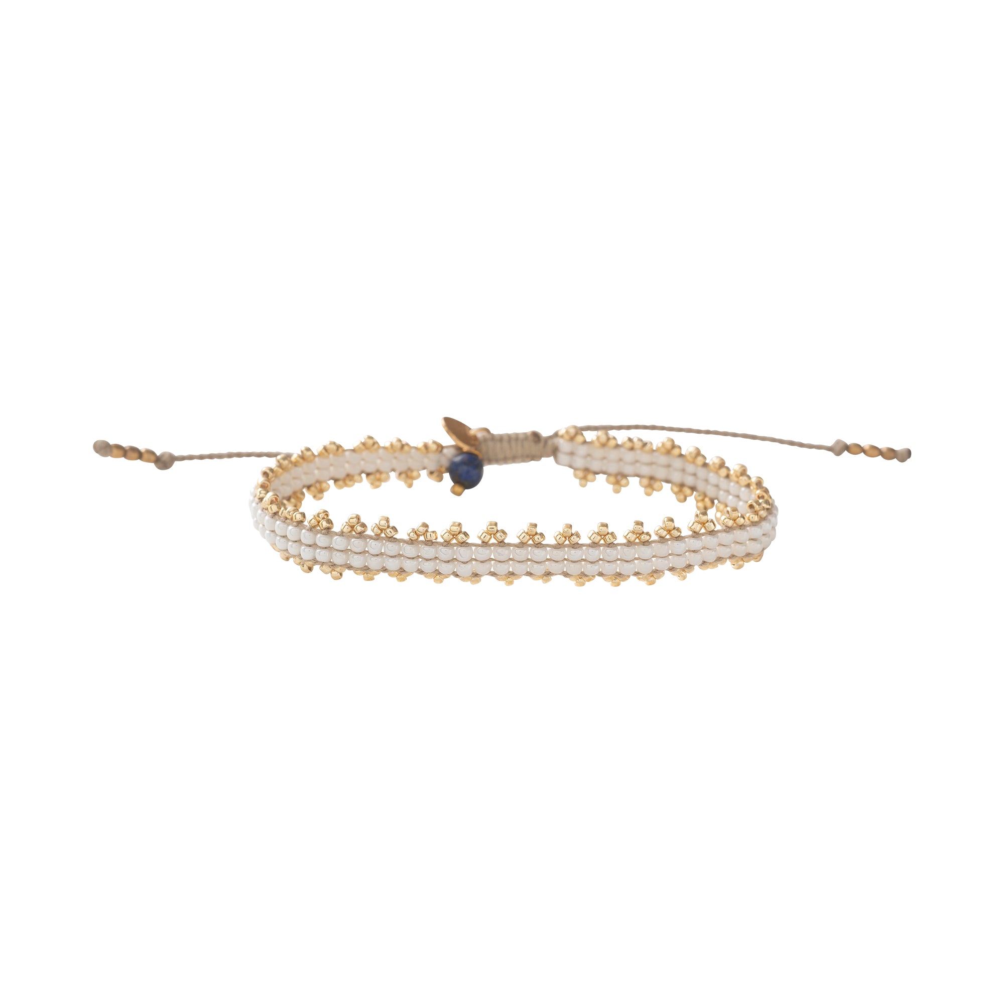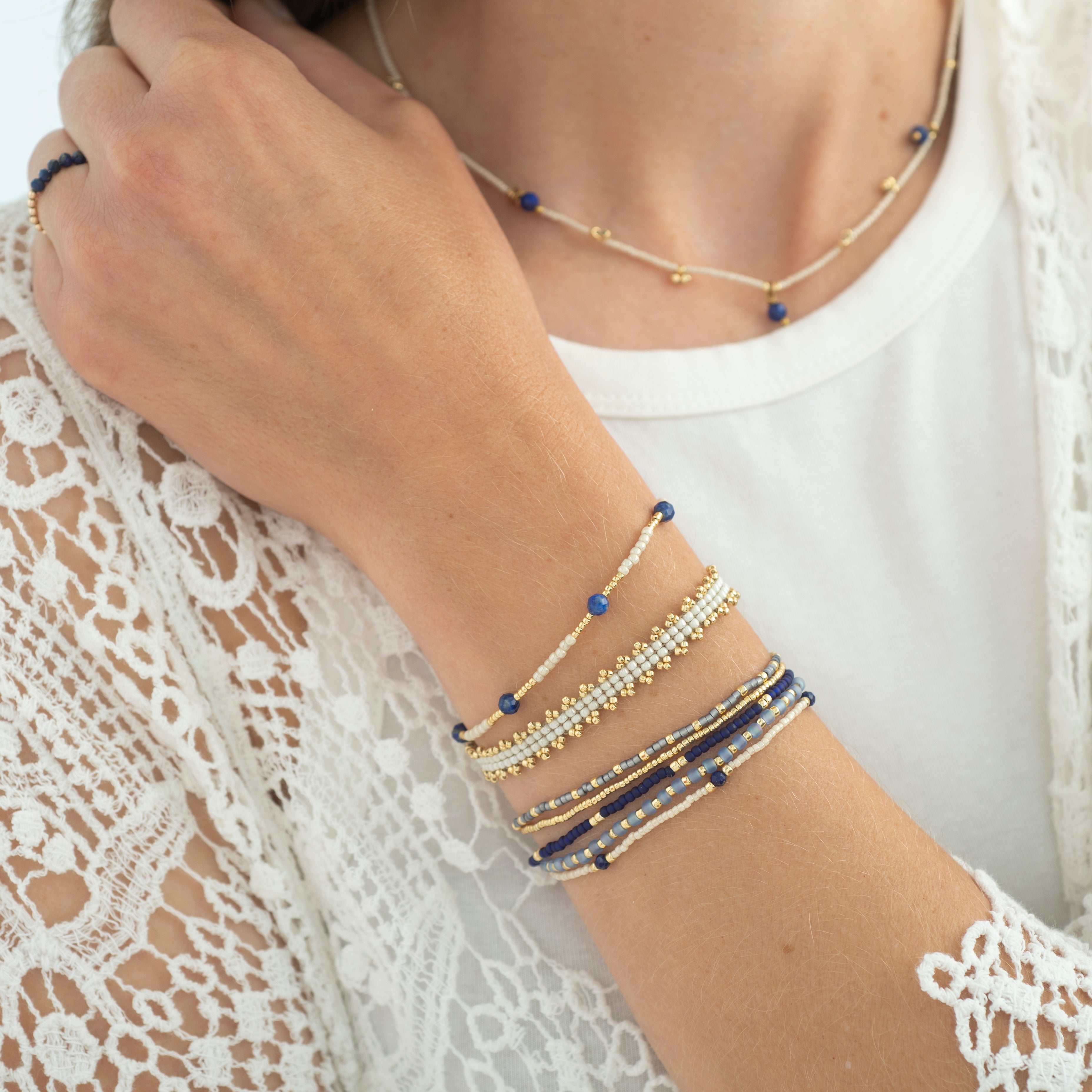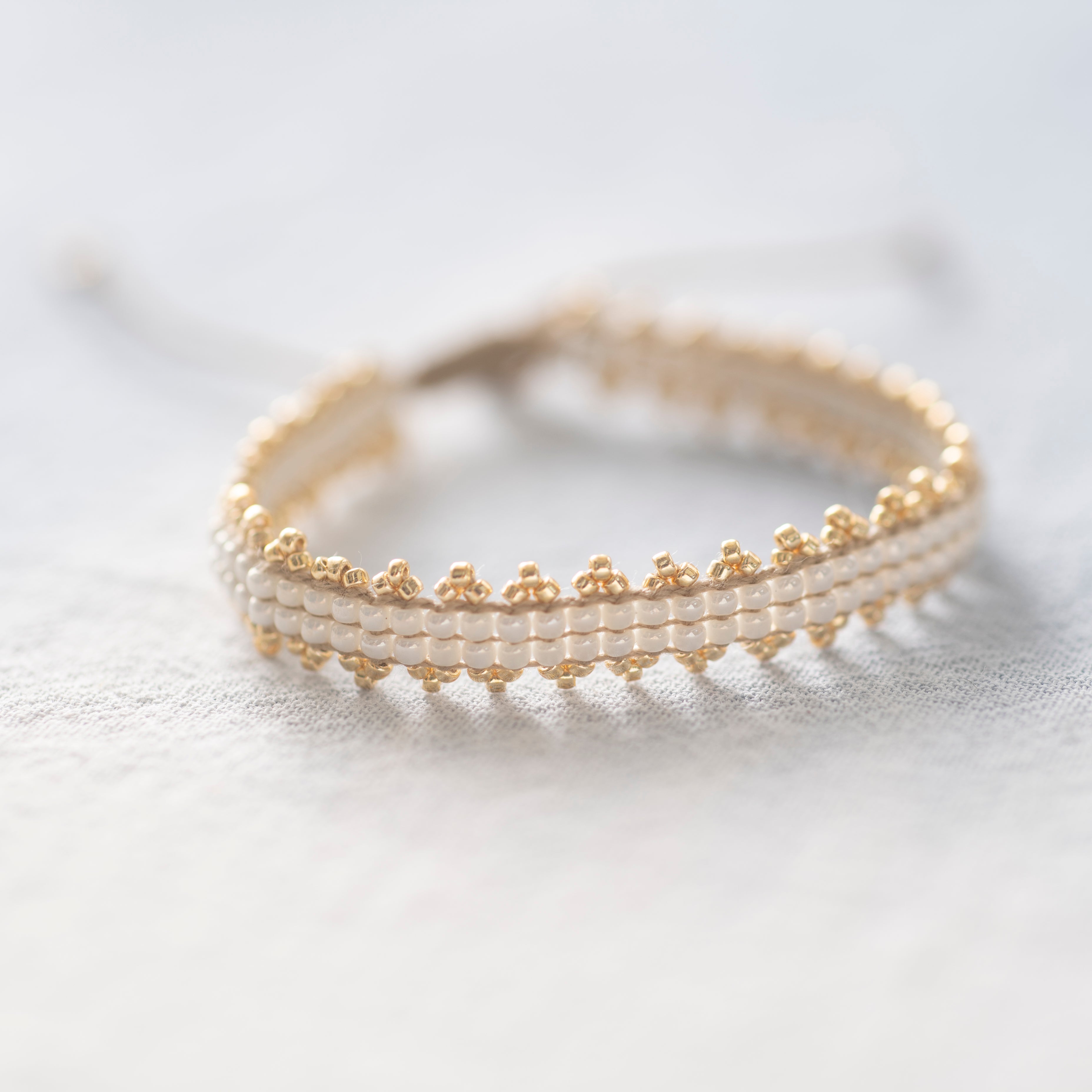 Dieses Armband besteht aus Glasperlen, Messingperlen und einem kleinen Rosenquarz-Edelstein, aufgereiht auf einem Draht. Das Armband ist verstellbar durch einen Schiebeknoten aus Baumwollgarn.