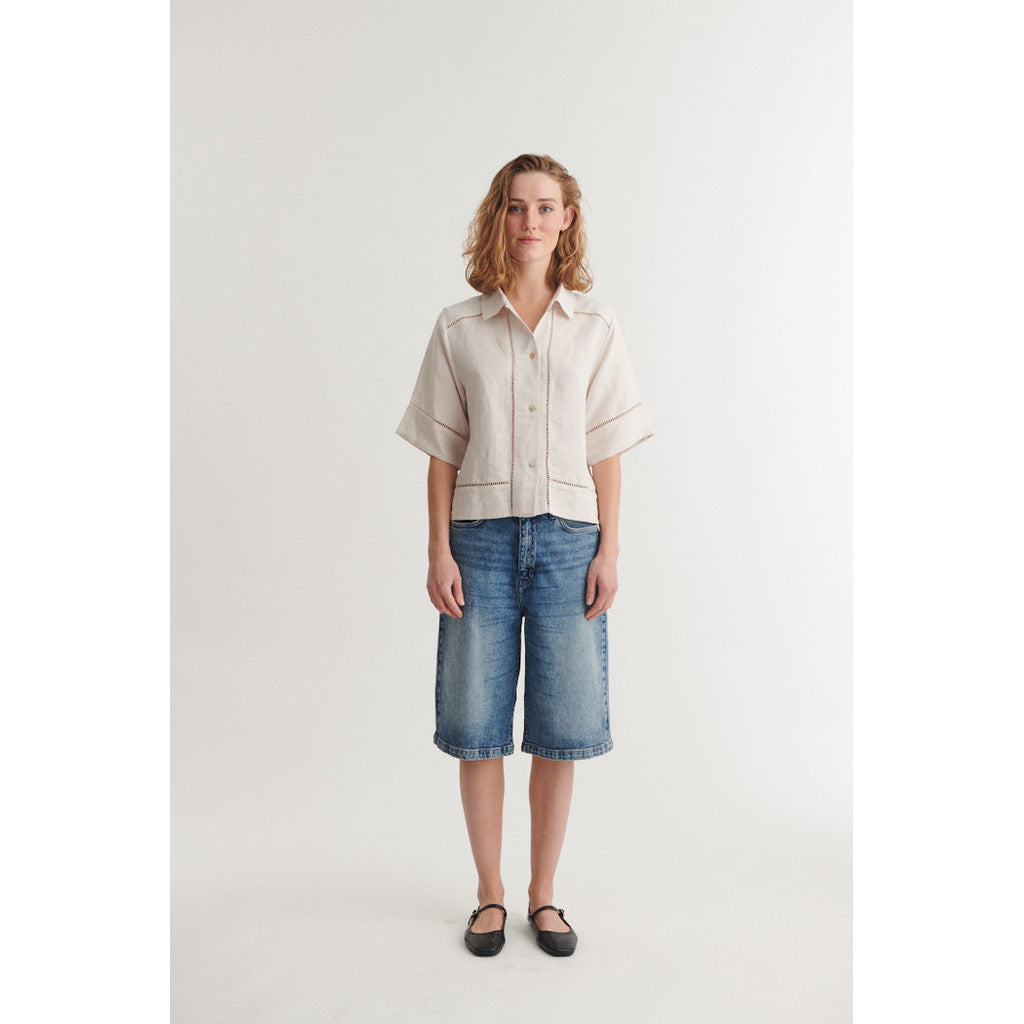 Das Arina SS Shirt ist ein kurzärmeliges Hemd mit Kragen, Knopfleiste und lockerer Passform, das einen leichten und mühelosen Look kreiert. Der gewebte Stoff fällt weich und macht das Hemd bequem für den Alltag.
