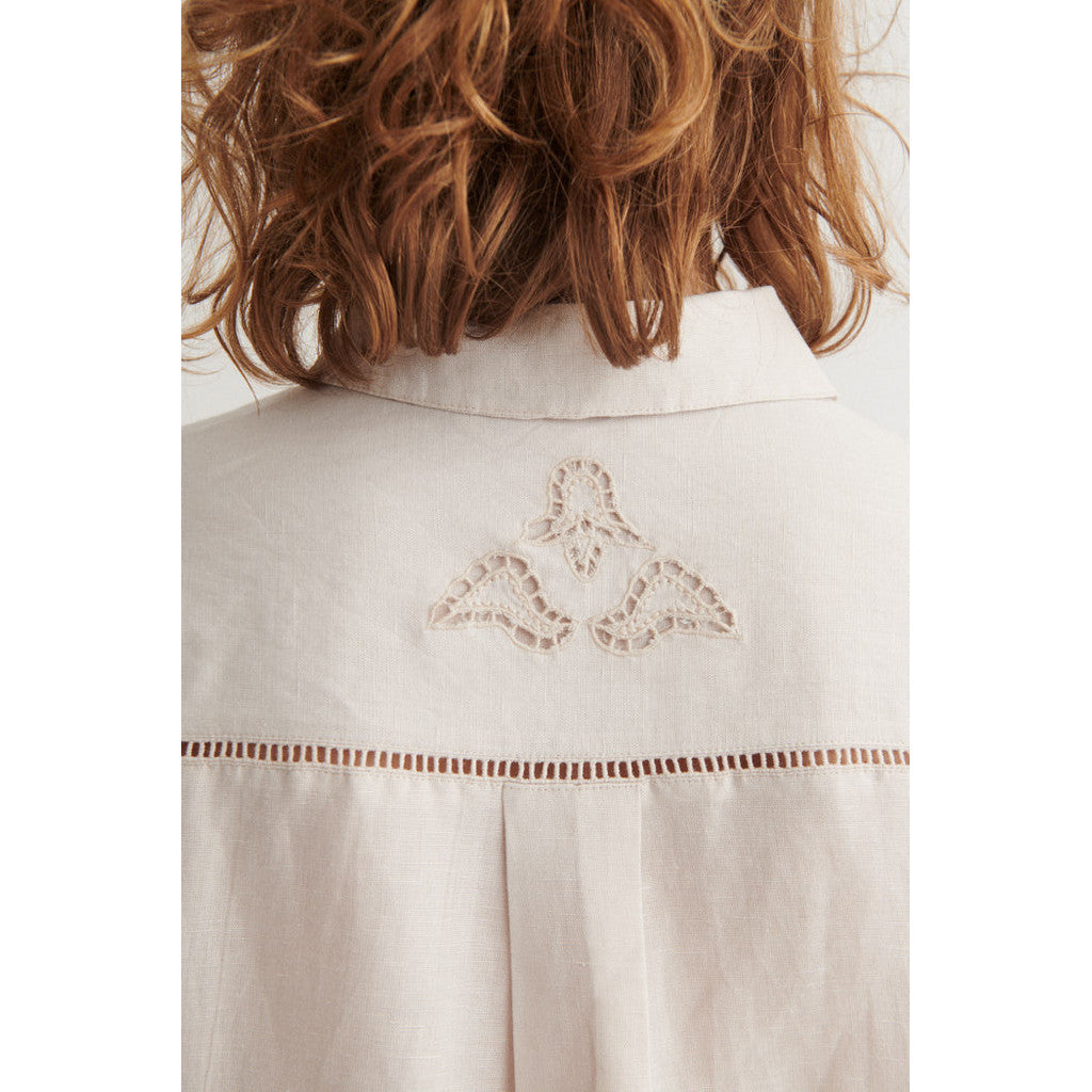 Die Stickerei auf der Rückseite sorgt für ein dezentes Detail, das Charakter verleiht, ohne das klare Design zu überlagern. Es lässt sich gut mit Hosen, Shorts oder einem Rock kombinieren und kann sowohl zugeknöpft als auch leicht geöffnet getragen werden.