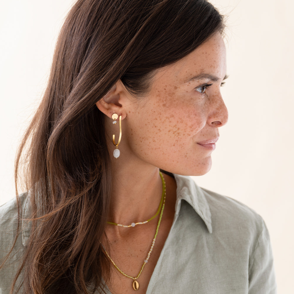 Entdecke die Attracted Mondstein Vergoldete Ohrringe von A Beautiful Story. Diese wunderschönen Ohrringe sind von Hand aus vergoldetem Messing gefertigt und mit einem großen Karneol-Edelstein versehen. Die Ohrringe sind 4,5 cm lang.