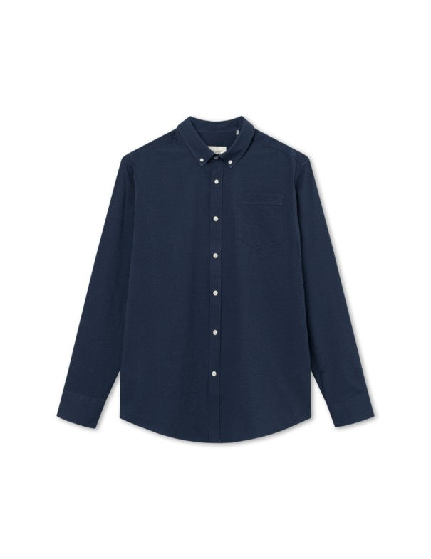 Crafted from a comfortable cotton-blend seersucker, its puckered surface enhances breathability. This shirt is tailored for a laid-back fit and adorned with a subtle embroidered forét logo in the cuff.