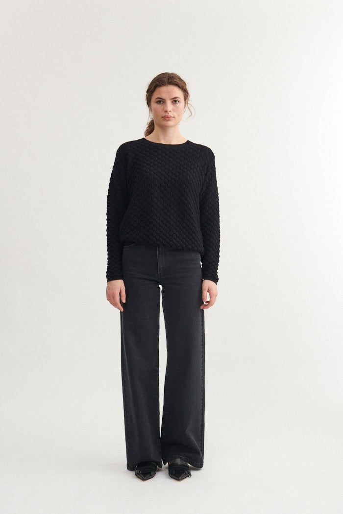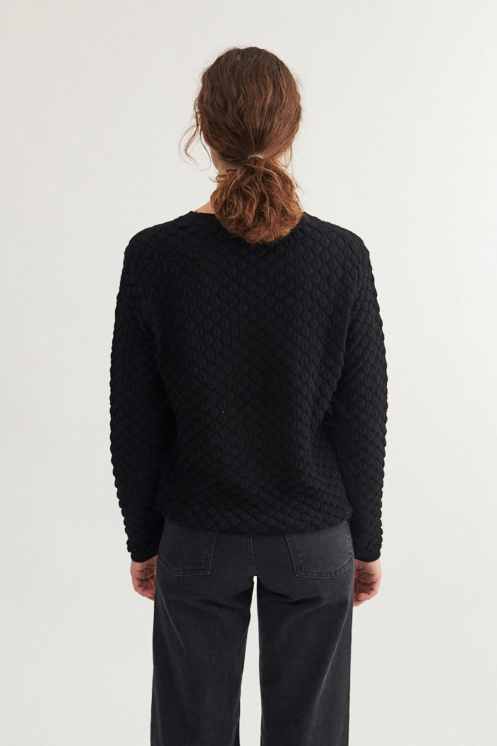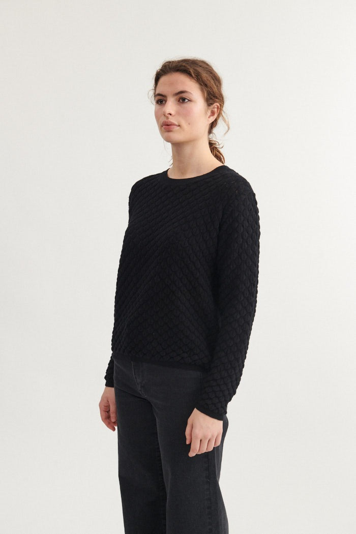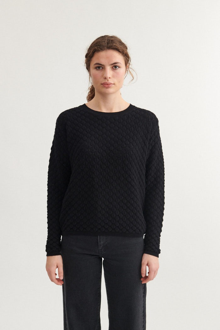 Der Camilla-Pullover besteht aus 100 % Bio-Baumwolle und ist mit einem Blattmuster in der Struktur gestrickt.