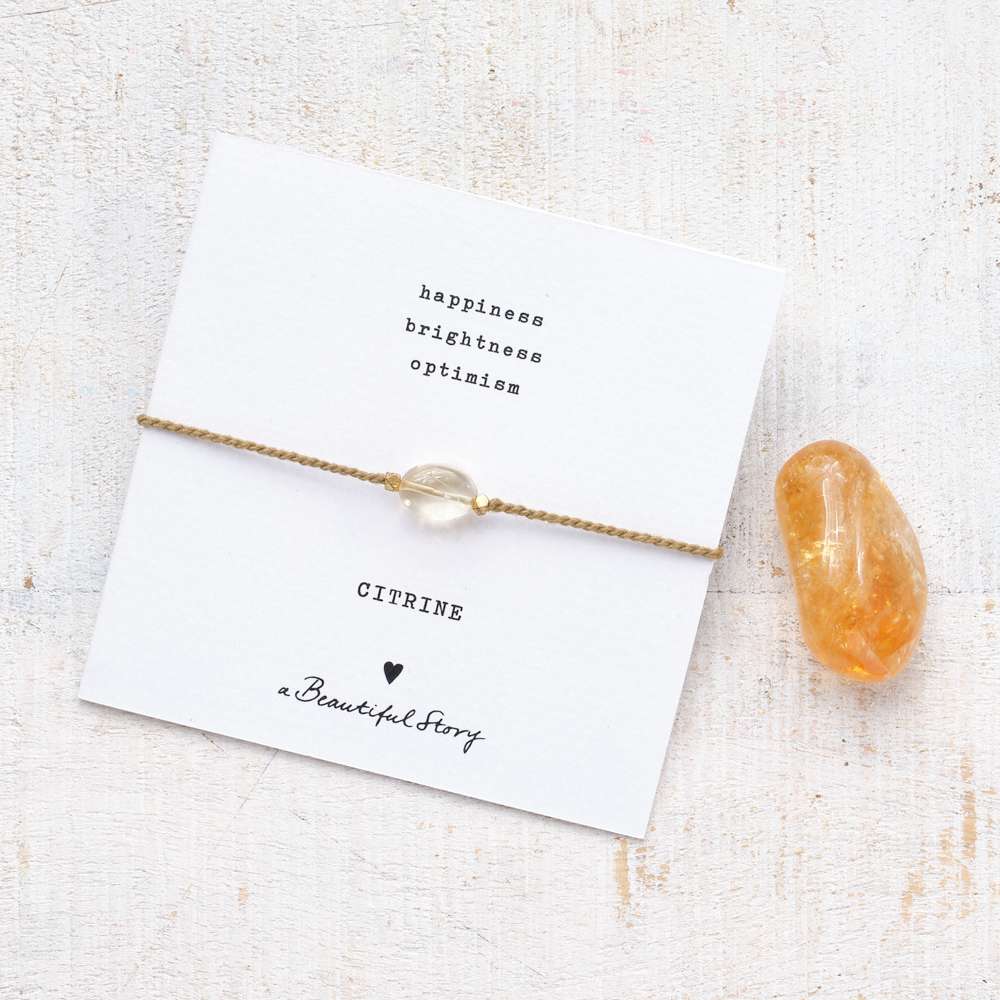 Dieses Armband ist hergestellt aus Baumwollgarn und einem mittig platzierten Citrin Edelstein. Das Armband ist verstellbar durch einen Schiebeknoten.