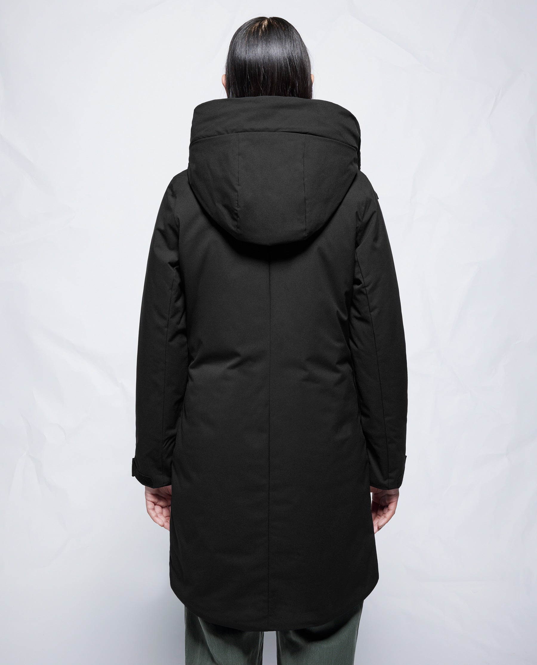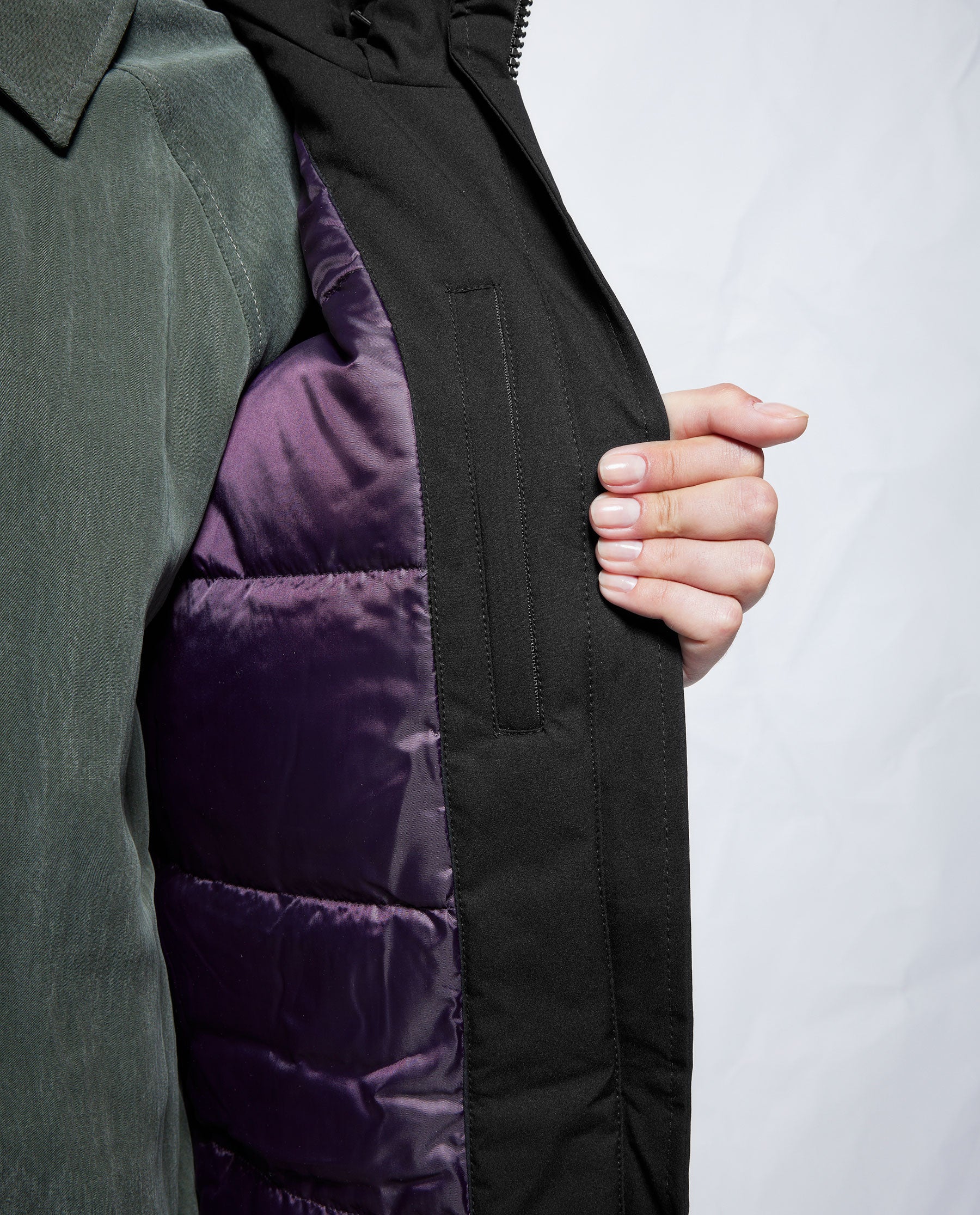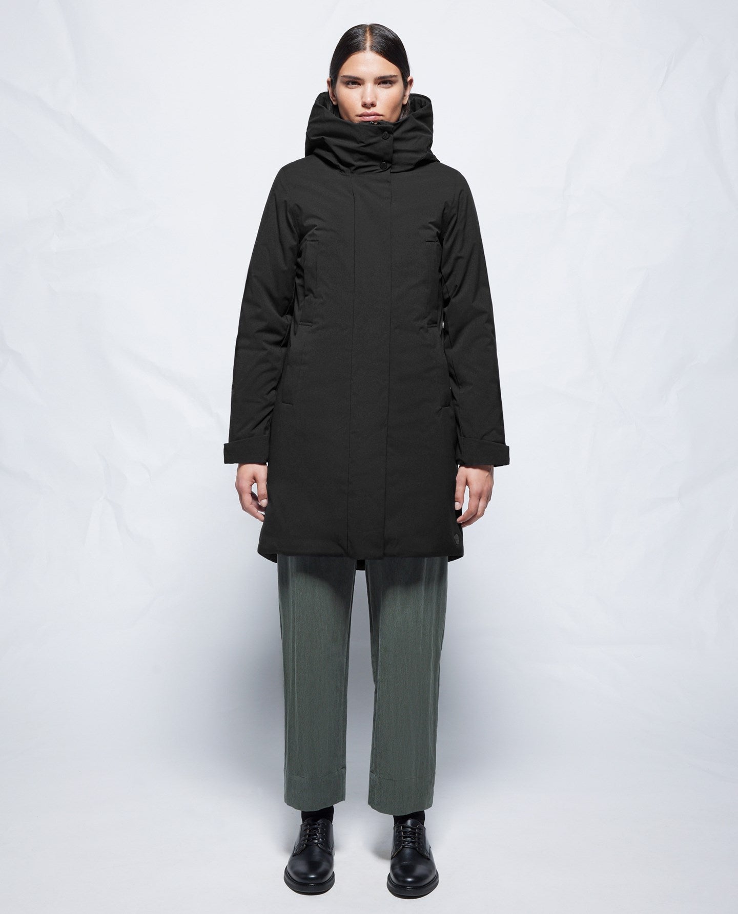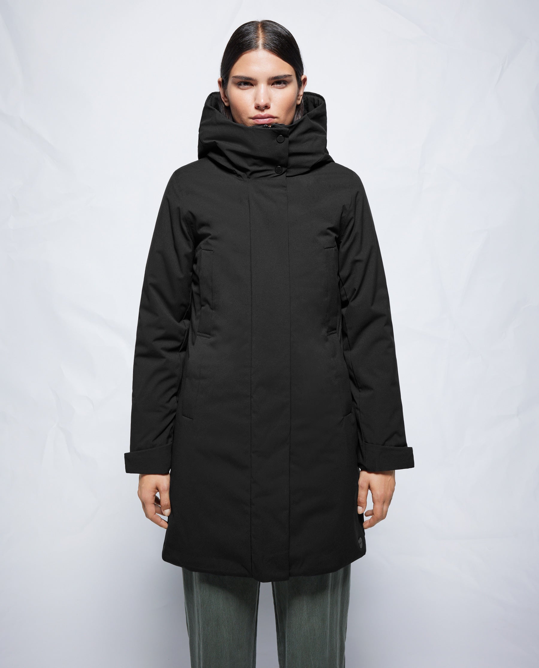 Eline is a hooded winter jacket with a fitted silhouette made in a Pet Poly 5K fabric. The material is quick-drying and has a waterproof membrane that protects from sudden downpour. The 4-way stretch adds comfort while a brilliant colour fastness maintains the jacket’s fresh look from one season to another. Details include double welt pockets and vital taped seams. Eline brings a sophisticated, active look in cold city winters. The model is 176 cm tall and wearing a size S. Length of winter jacket: 96 cm (size S)