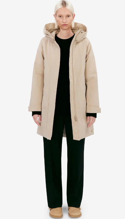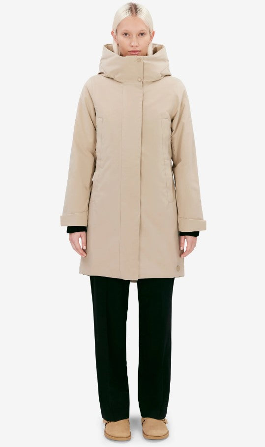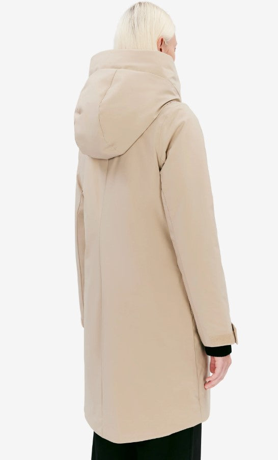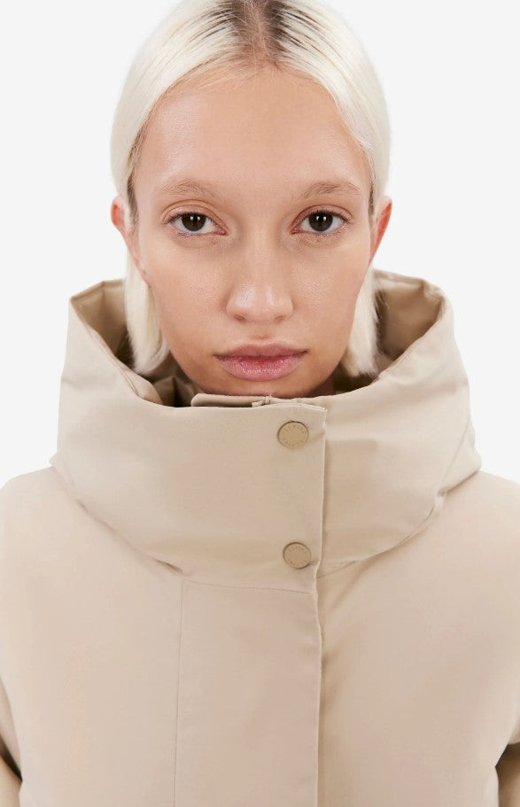Eline is a hooded winter jacket with a fitted silhouette made in a Pet Poly 5K fabric. The material is quick-drying and has a waterproof membrane that protects from sudden downpour. The 4-way stretch adds comfort while a brilliant colour fastness maintains the jacket’s fresh look from one season to another. Details include double welt pockets and vital taped seams. Eline brings a sophisticated, active look in cold city winters. The model is 176 cm tall and wearing a size S. Length of winter jacket: 96 cm