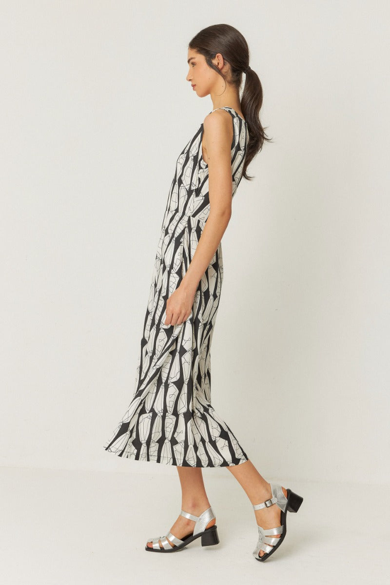 Sleeveless, mid-length dress with a flared cut. It has a round collar, a deep cut-out at the back and hand pockets.