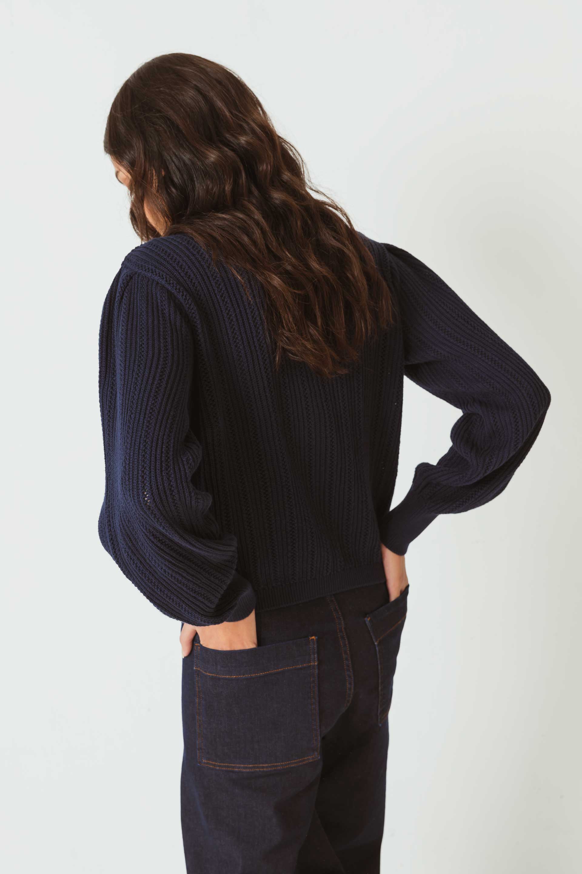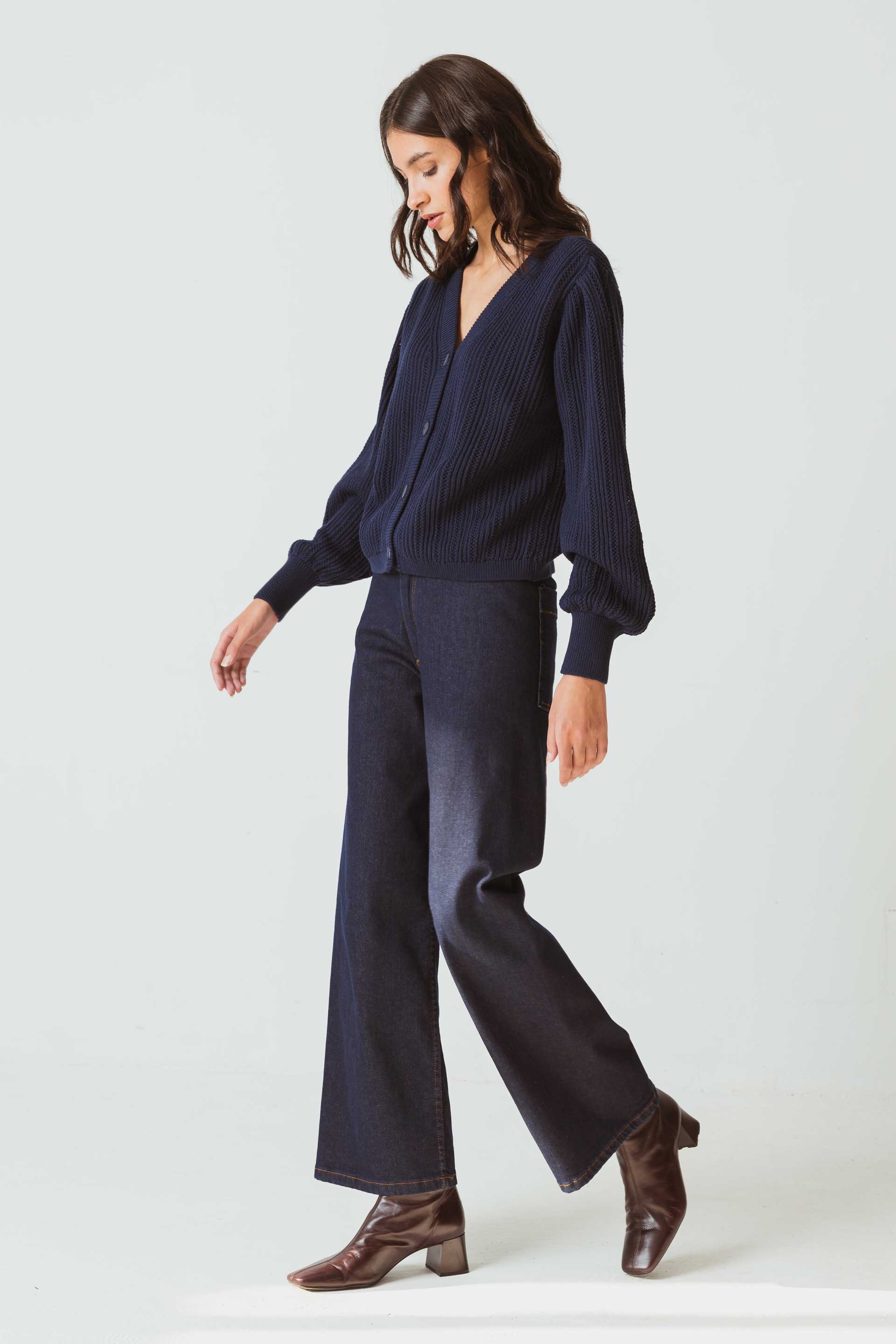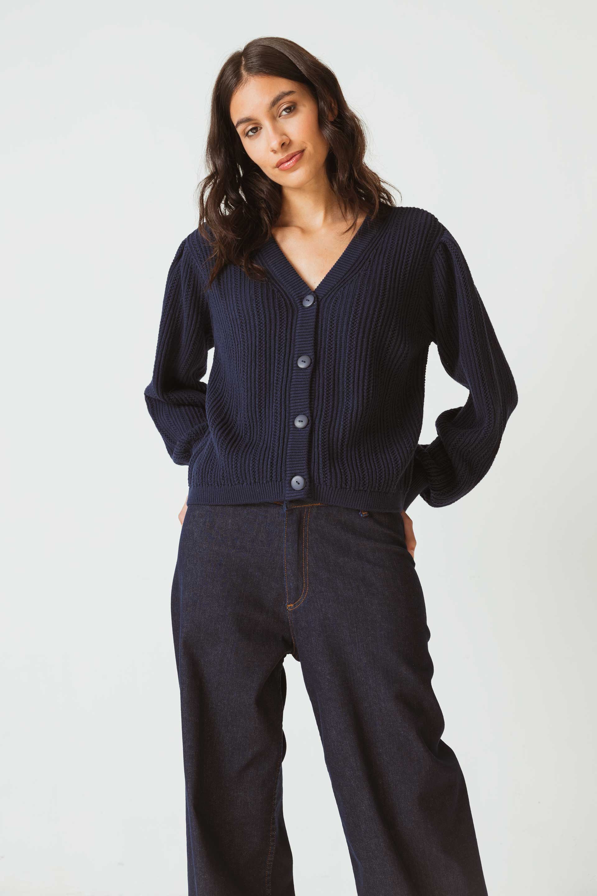 Long-sleeved buttoned sweater with a V-neck, made of a GOTS and Fairtrade® certified organic cotton fantasy knit. Emerald green. Being certified feels great. Fairtrade® is a way to conduct business that guarantees that farmers at the origin of our cotton are paid fairly; it also gives them subsidies for developing community projects. GOTS is recognised as the world’s leading processing standard for textiles made from organic fibres. This fiber uses 91% less water and means cleaner air, better soil and better livelihoods for our farmers. the environment. This means no use of toxic fertilizers and pesticides and maintenance of soil fertility. no use of toxic fertilizers and pesticides and maintenance of soil fertility.