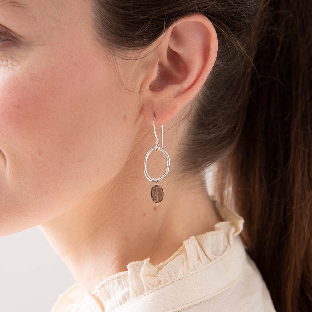Versilberte Ohrringe aus Messing mit einem Rauchquarz an einem großen ovalen Ring.