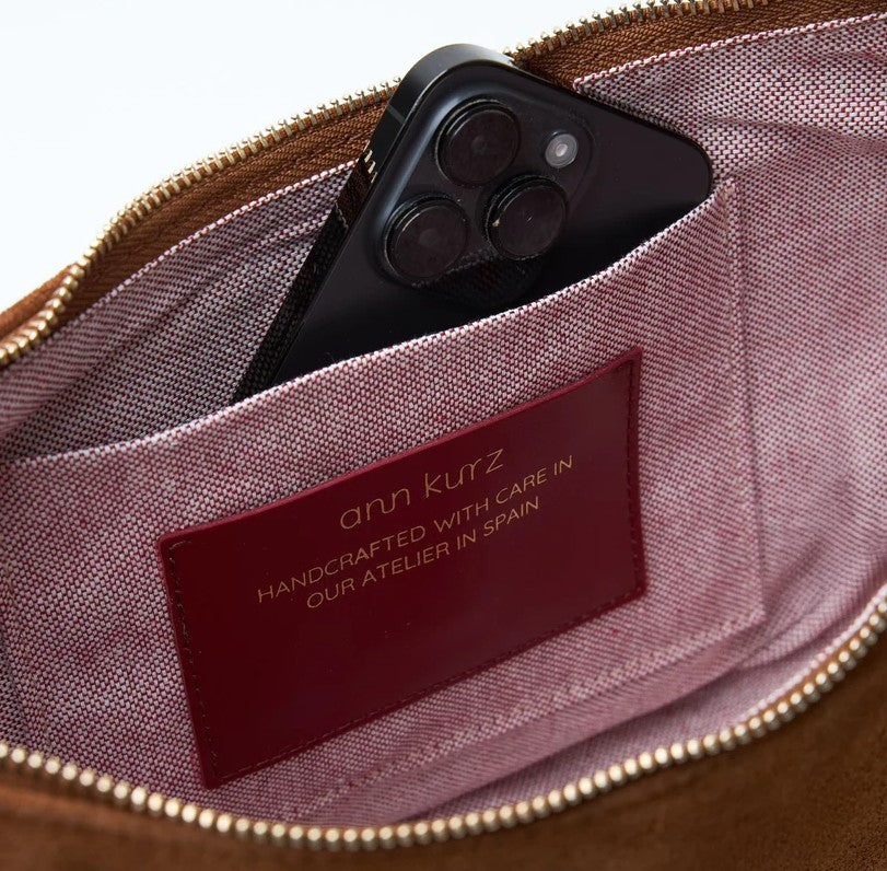 The bag features a small internal pocket, and the exterior is decorated with the engraved logo. The strap has knots to adjust its size. Perfect for adding a fun touch to your look while carrying your essentials.