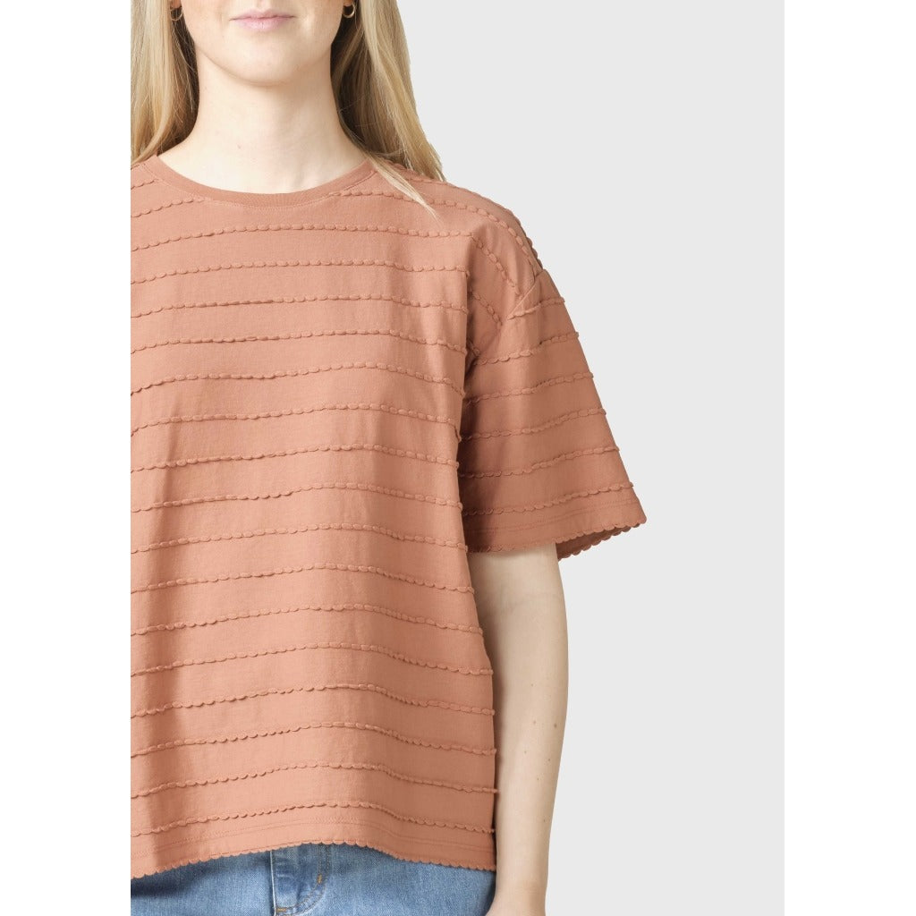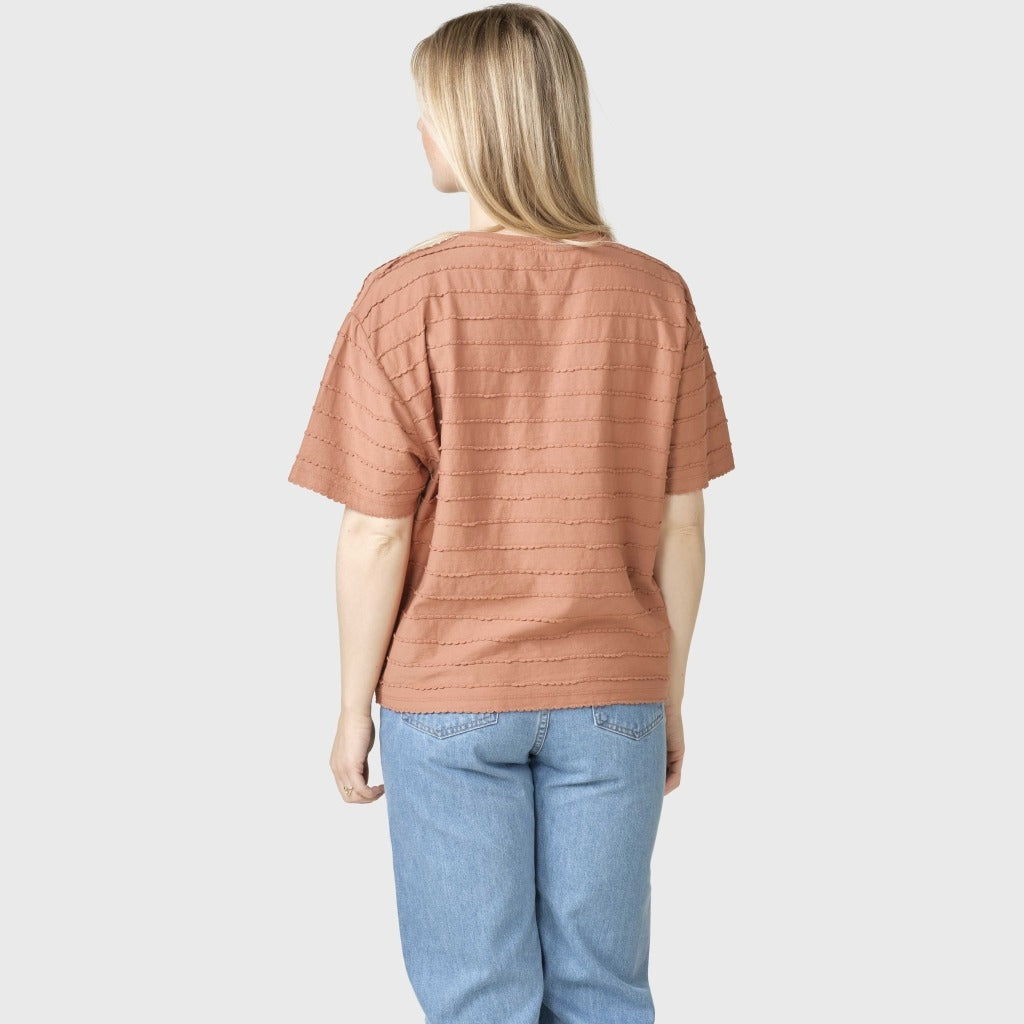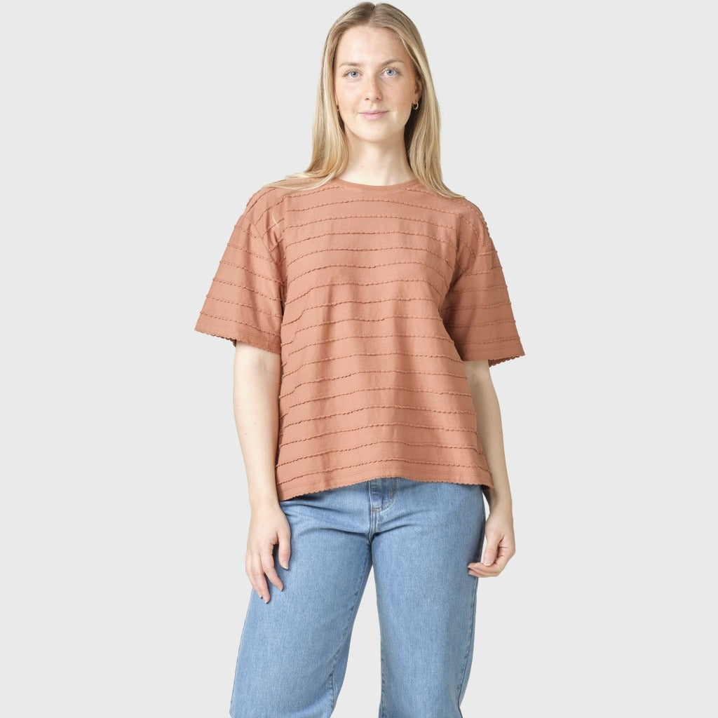 Die variierende Fadenstruktur des Stoffes verleiht dem T-Shirt einen schönen Ausdruck und eine texturierte Oberfläche, die es zu mehr als nur einem einfachen Basic macht. Kombiniere Harper zum Beispiel mit einer unserer beliebten Lydia pant für ein bequemes und stilvolles Alltagsoutfit, das sowohl weich als auch raffiniert ist.