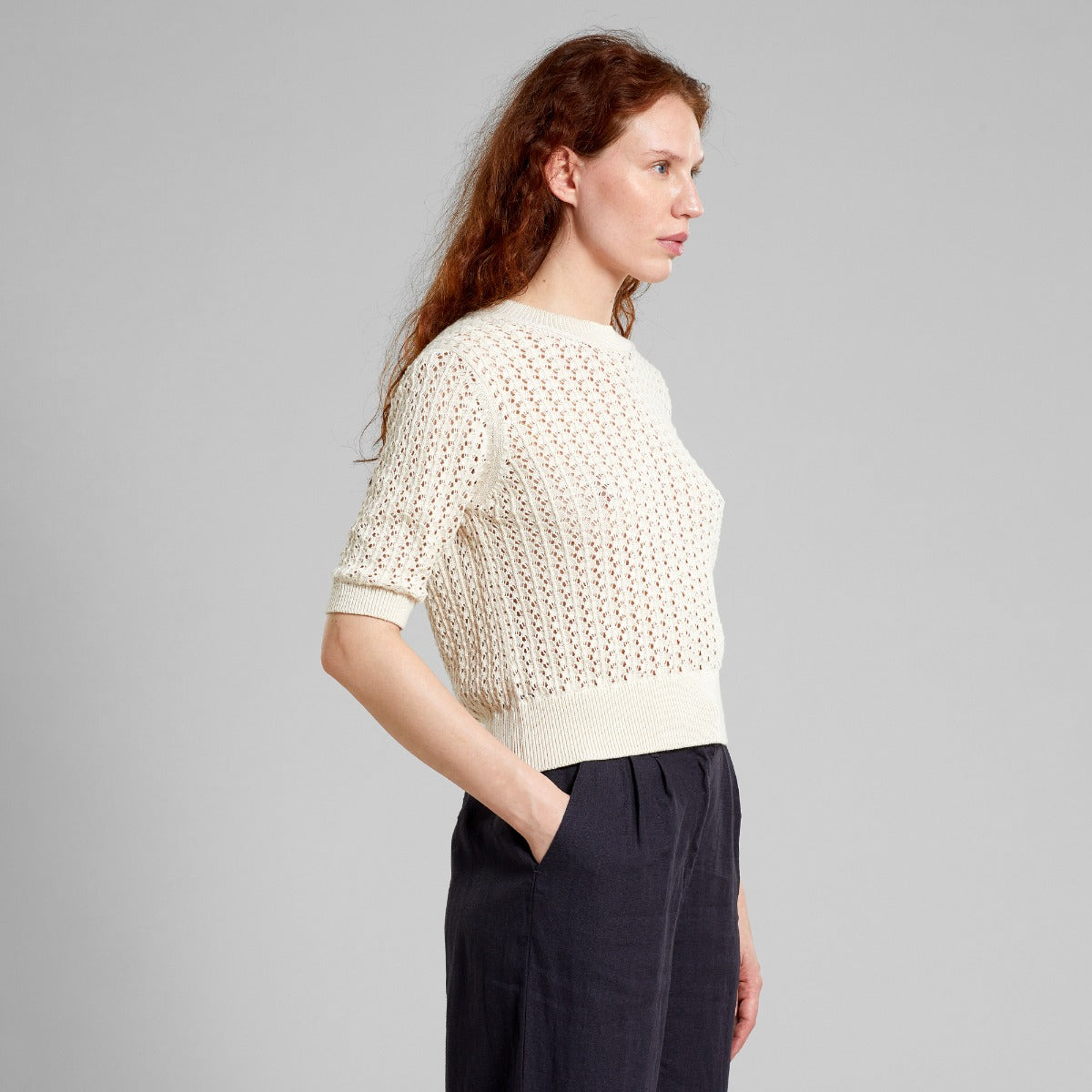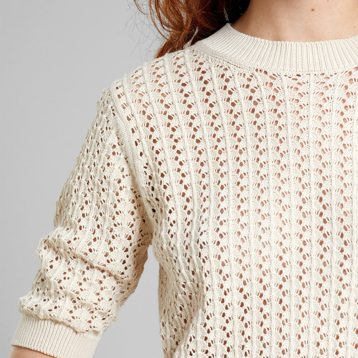 Gestricktes ärmelloses Kleid mit geripptem Rundhalsausschnitt und gerippter Ärmelöffnung. Hergestellt aus Pointelle-Strick in Häkeloptik.