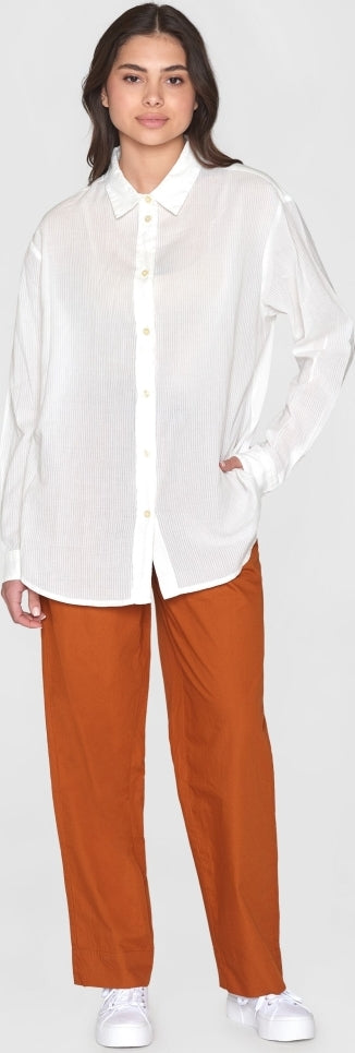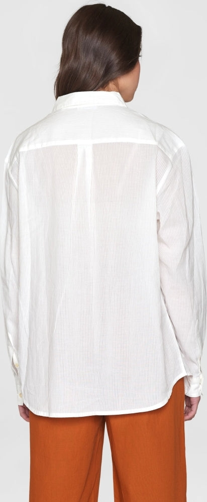 Add a classic staple to your everyday wardrobe. This loose fit shirt is made of 100% organic cotton, which makes it very soft and durable. The structured design has simple stripes, dropped shoulders, long sleeves, and a classic collar with button-closure.