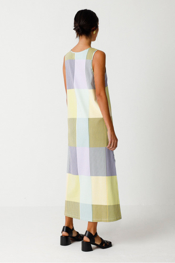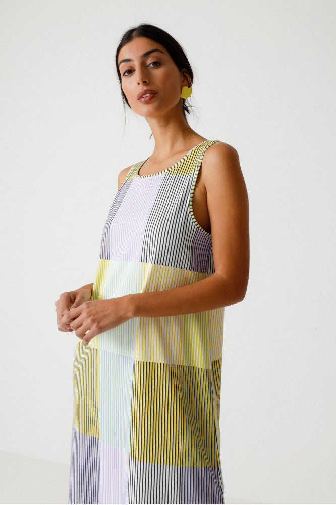 GOTS certified organic cotton knit tank dress. Comfortable long style with a round collar and side apertures. Light graphic print.