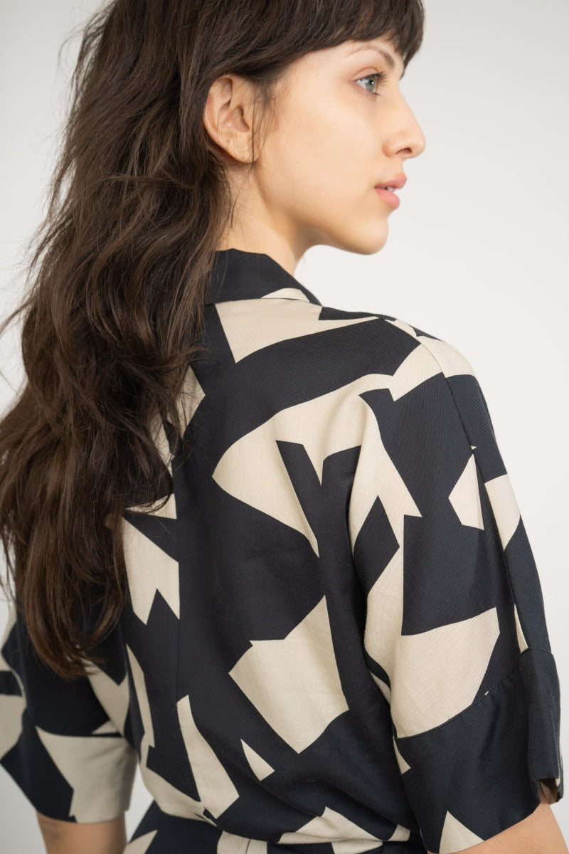 Sommerlicher Jumpsuit aus Tencel - Baumwollengemisch mit Resort-Kragen und elastischen Taillenbund mit Bändel.