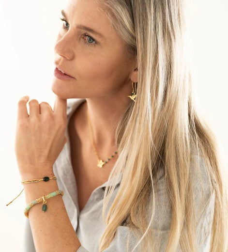 Das goldfarbige Shining Aventurine Armband ist handgefertigt mit einem glatten Aventurin Edelstein in der Mitte. Das Armband hat zwei Bänder mit rosa, grünen und goldfarbenen Glasperlen. Mit seinem verstellbaren Schiebeknoten passt dieses Armband perfekt an jedes Handgelenk. Mit Aventurin gehst du deine eigenen Wege und ziehst in die Welt hinaus. Du machst jeden Schritt mit Freude.