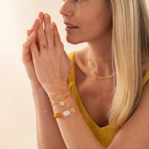 Das goldfarbige Shining Citrin Armband ist handgefertigt mit einem glatten Citrin Edelstein in der Mitte. Das Armband hat zwei Bänder mit gelben, orangefarbenen und goldfarbenen Glasperlen. Mit seinem verstellbaren Schiebeknoten passt dieses Armband perfekt an jedes Handgelenk. Der Citrin füllt jeden Moment mit Glück und Freude.