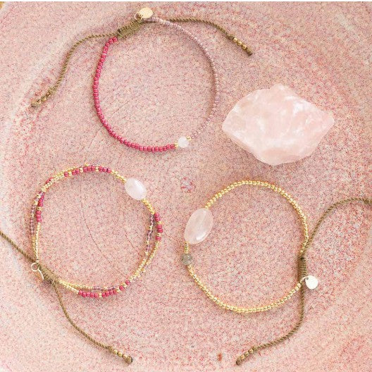Das goldfarbige Shining Rosenquarz Armband ist handgefertigt mit einem glatten Rosenquarz Edelstein in der Mitte. Das Armband hat zwei Bänder mit rosa und goldfarbenen Glasperlen. Mit einem verstellbaren Schiebeknoten passt dieses Armband perfekt an jedes Handgelenk. Der Rosenquarz bringt Liebe und Harmonie in dein Leben.