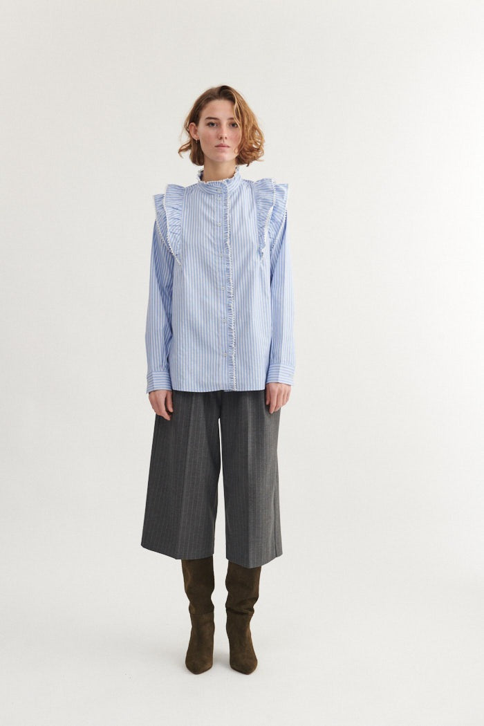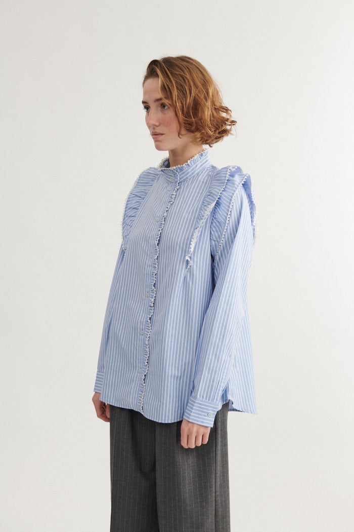 Das Silje Frill Shirt ist aus einem wunderschönen gestreiften Baumwollpopeline-Stoff gefertigt.