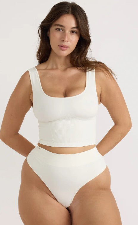 A seamless thong made in a soft, sleek, and smooth recycled material. Features a thicker seamless waistband and high-leg cut for an ultra-flattering fit.