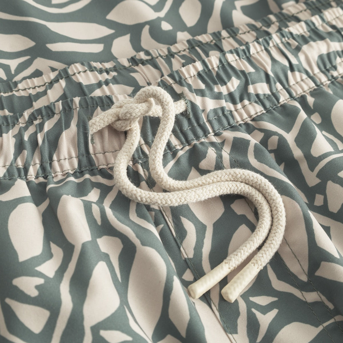 Mittellange Badeshorts aus recycelten PET-Flaschen. Netzfutter und zwei Seitentaschen, eine Gesäßtasche mit Klettverschluss und Kordelzug am Bund.