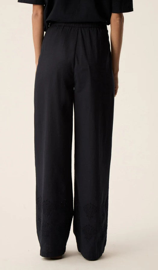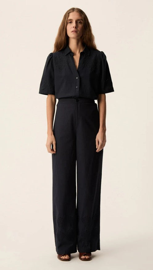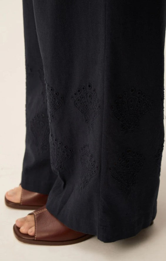 Die Hose Tamara ist ein zeitloses Basic, das in einer sehr bequemen Version aus Baumwolle und Leinen interpretiert wird und mit muschelförmigen Stickereien am unteren Rand der Beine verziert ist, die eine schicke und grafische Saison ankündigen.
