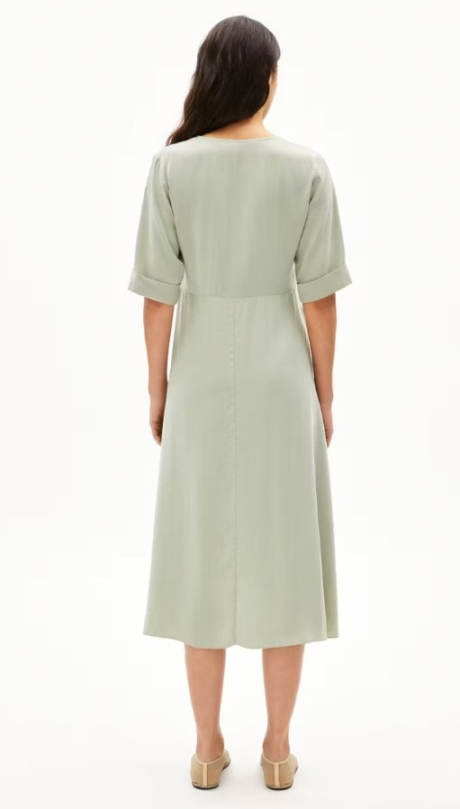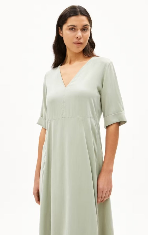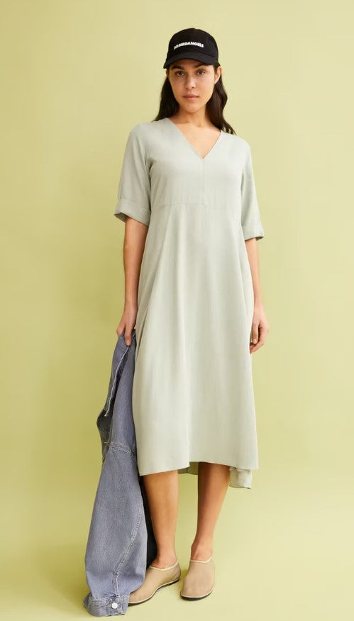 Das VAALI Kleid aus leichtem Webstoff überzeugt mit einer geraden, bequemen Passform und einem tiefen V-Ausschnitt. Der Midi-Schnitt und die Materialmischung aus Bio-Baumwolle und Bio-Wolle sorgen für ein angenehmes Tragegefühl.